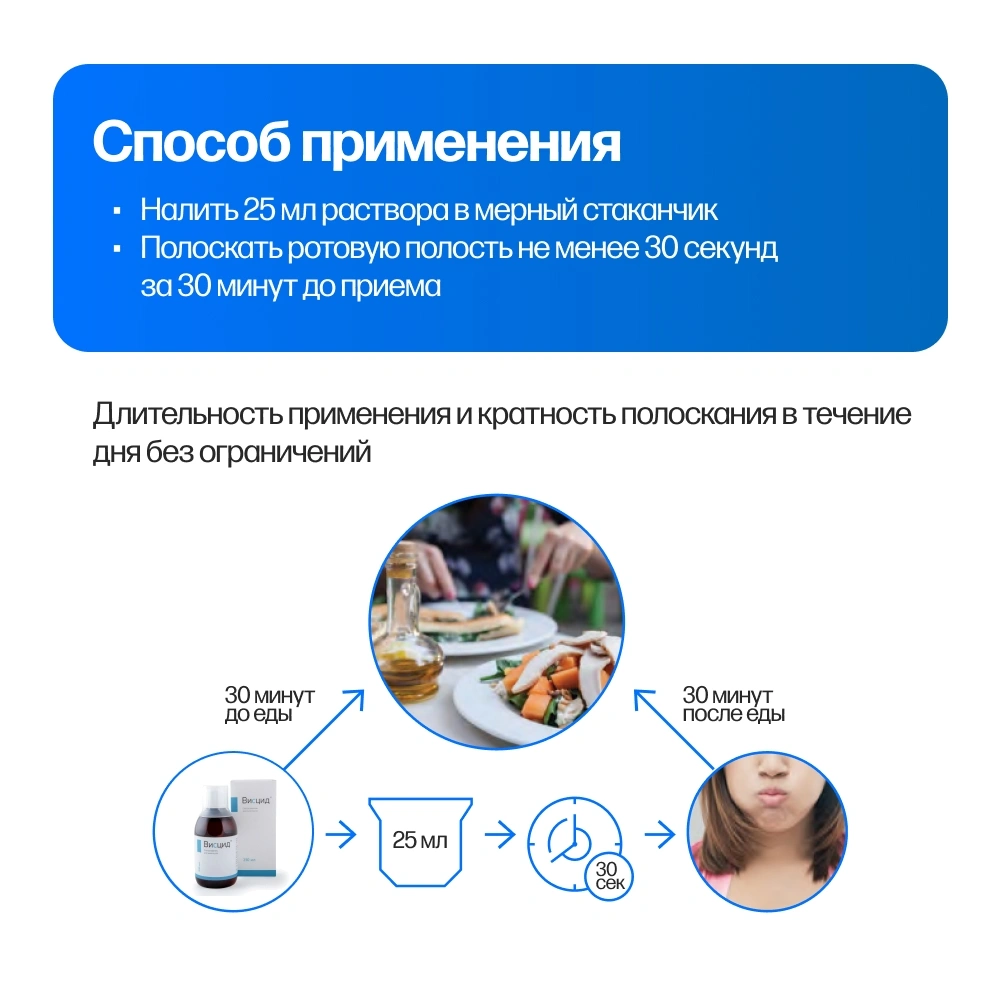 После полоскания не принимайте пищу и не пейте воду в течение 30 мин.
