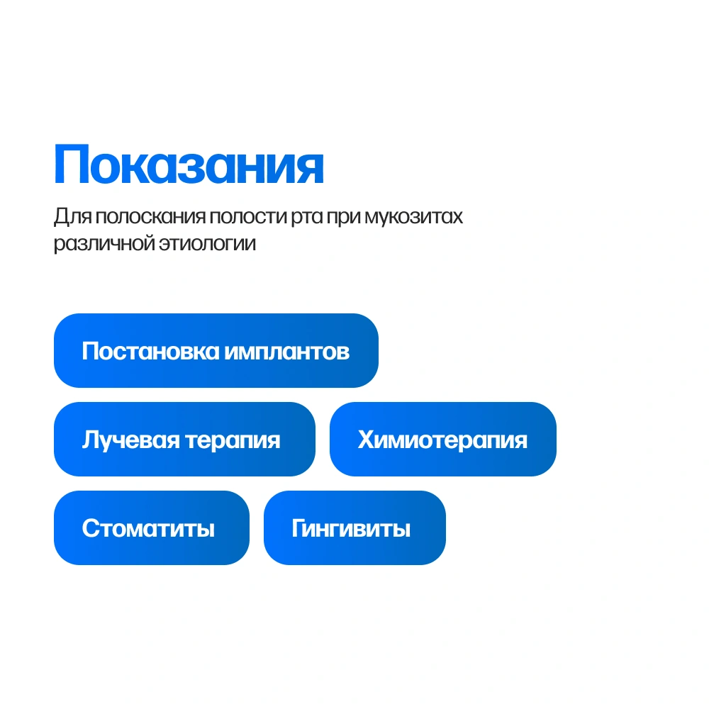 Рекомендуется для полоскания полости рта при воспалительных процессах на миндалинах, мягком и твердом нёбе, языке, щеках и дёснах. В том числе при поражениях, вызванных бактериями, вирусами и грибками.