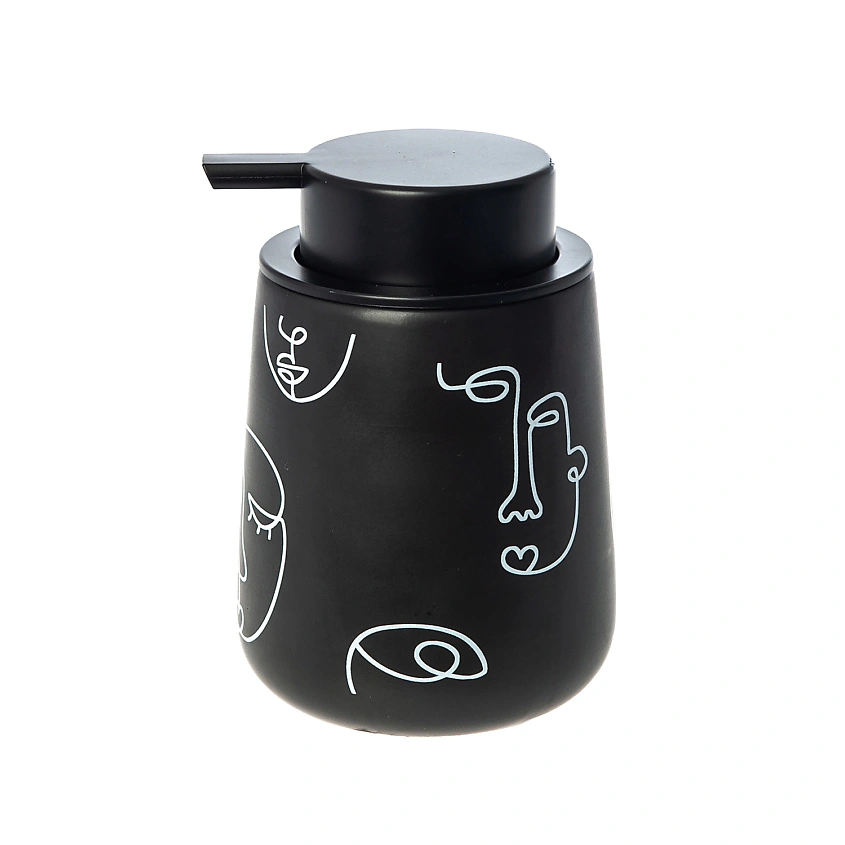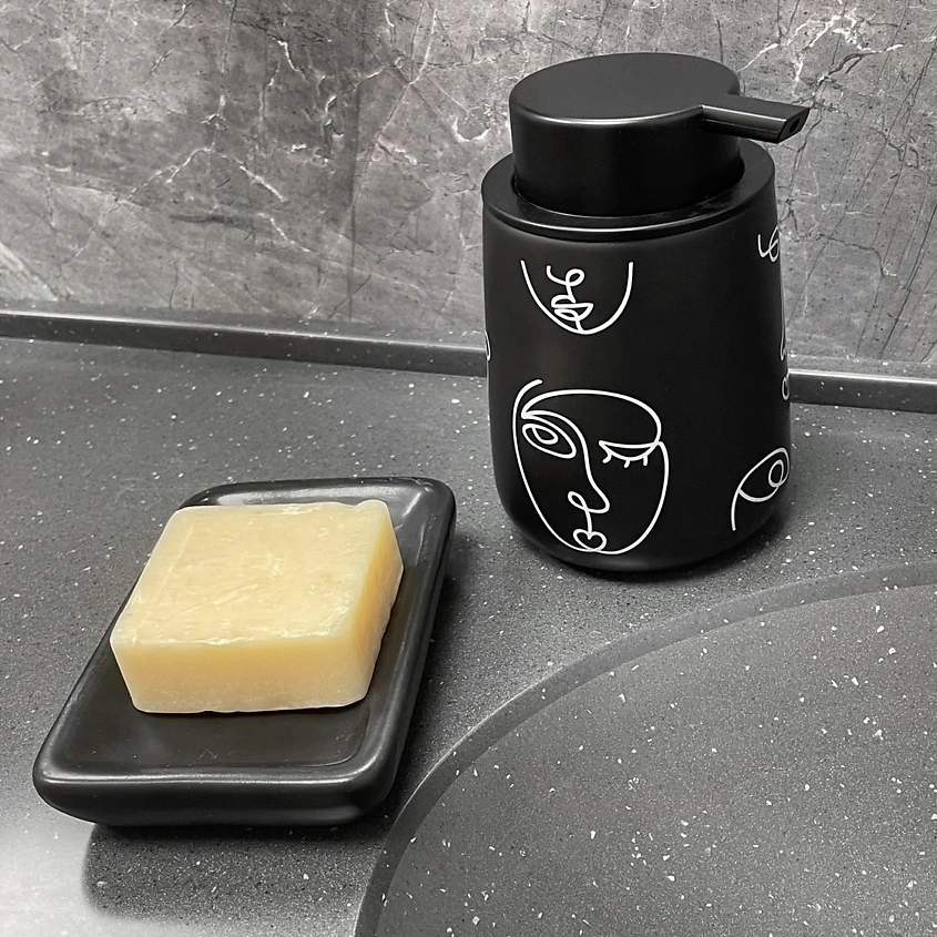 Диспенсер выполнен из качественной керамики в глубоком матовом чёрном цвете с декором в виде белых линий, напоминающих изображения лиц с полотен Анри Матисса. Это придаёт изделию уникальный и запоминающийся вид. Дозатор дополнен широкой чёрной матовой помпой, которая обеспечивает комфортное нажатие и удобное широкое отверстие для пополнения жидкого мыла.