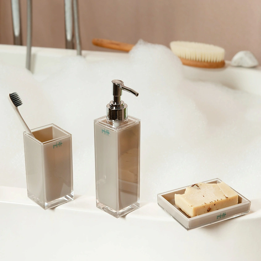 Трендовый цвет диспенсера Fresh Code тауп прекрасно сочетается как с светлыми, так и с темными интерьерами. Изготовленный из материала SAN — более прочного и износостойкого аналога полистирола, этот аксессуар гарантирует долговечность и комфорт в использовании. Дозатор идеально сочетается с мыльницей и стаканом для щеток из коллекции Глянцевый тауп, создавая гармоничную атмосферу в ванной комнате.