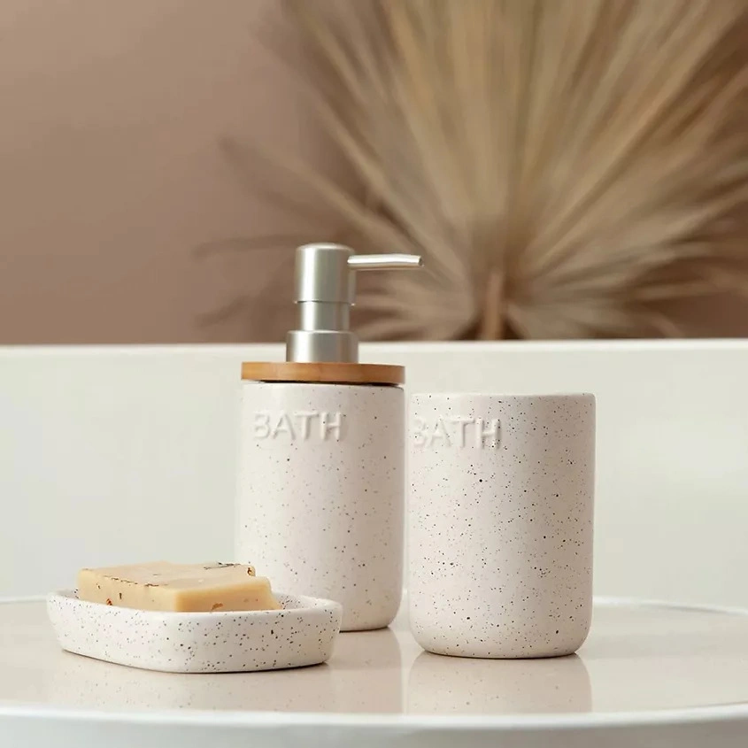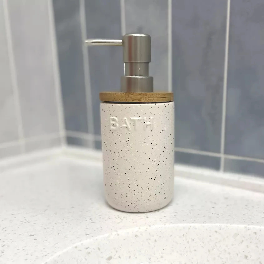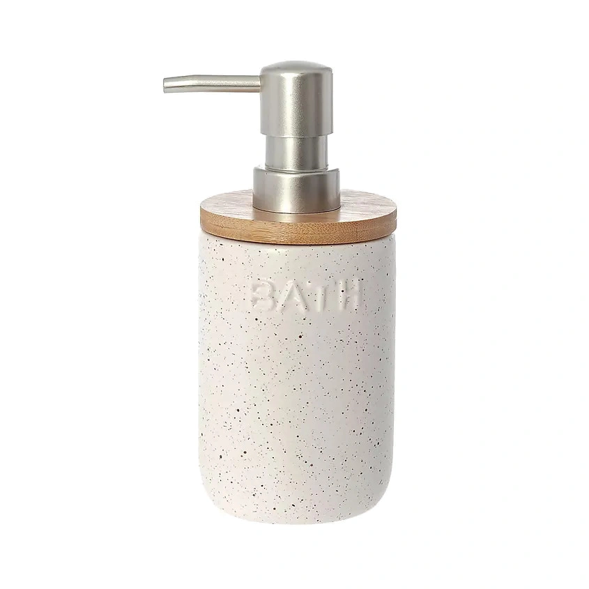 Стильный диспенсер для жидкого мыла, выполненный в молочном цвете с темно-бежевым крапом, и декорированный натуральным бамбуком, добавит вашему интерьеру нотки теплых воспоминаний об отпуске.