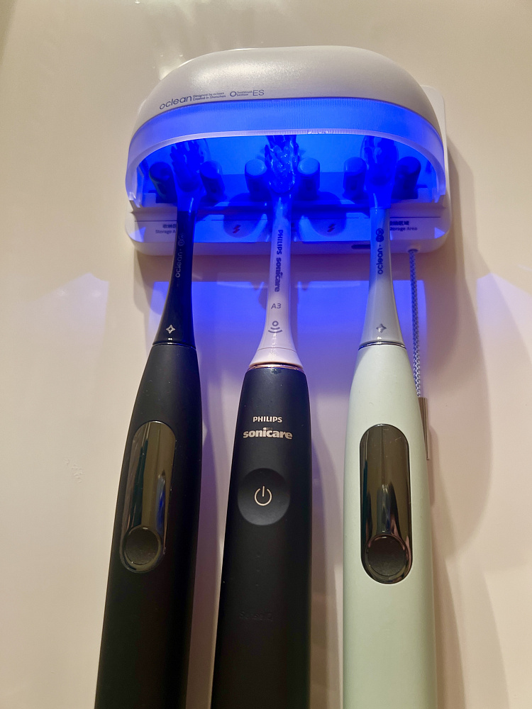 Очень удобный компактный прибор для дезинфекции зубных щёток и насадок. Есть несколько отделений, а также отдельная секция для хранения. Можно повесить на стену, включается с помощью шнурка, а также автоматически через определённое количество часов, что удобно, если вдруг забыли включить лампу. Зарядка usb, заряжается быстро. Если отделить прибор от держателя, то срабатывает автоблокировка и прибор нельзя использовать.