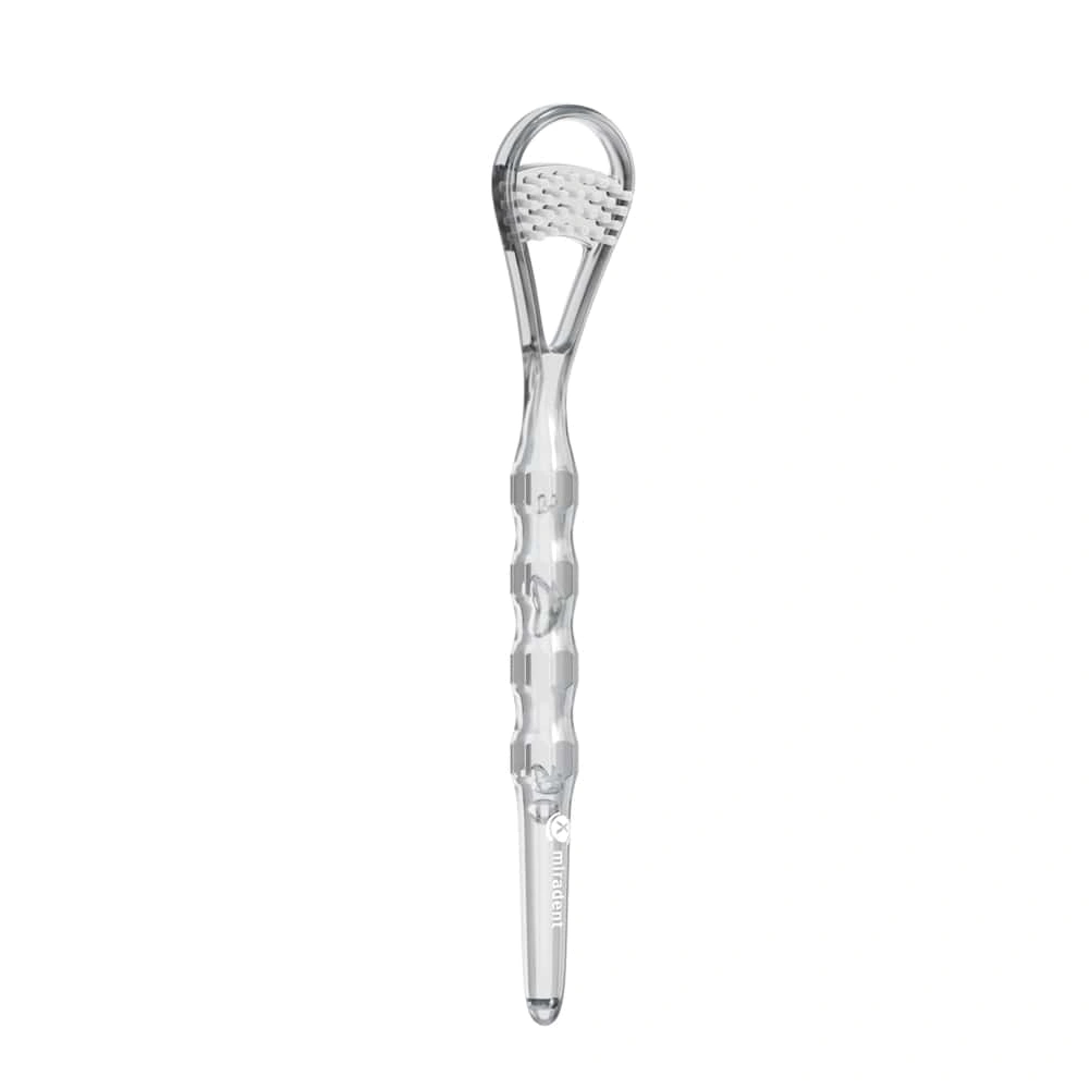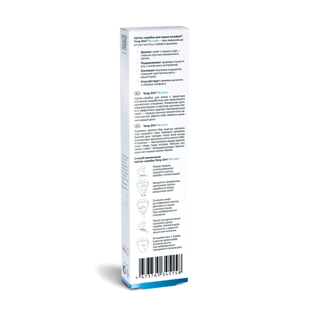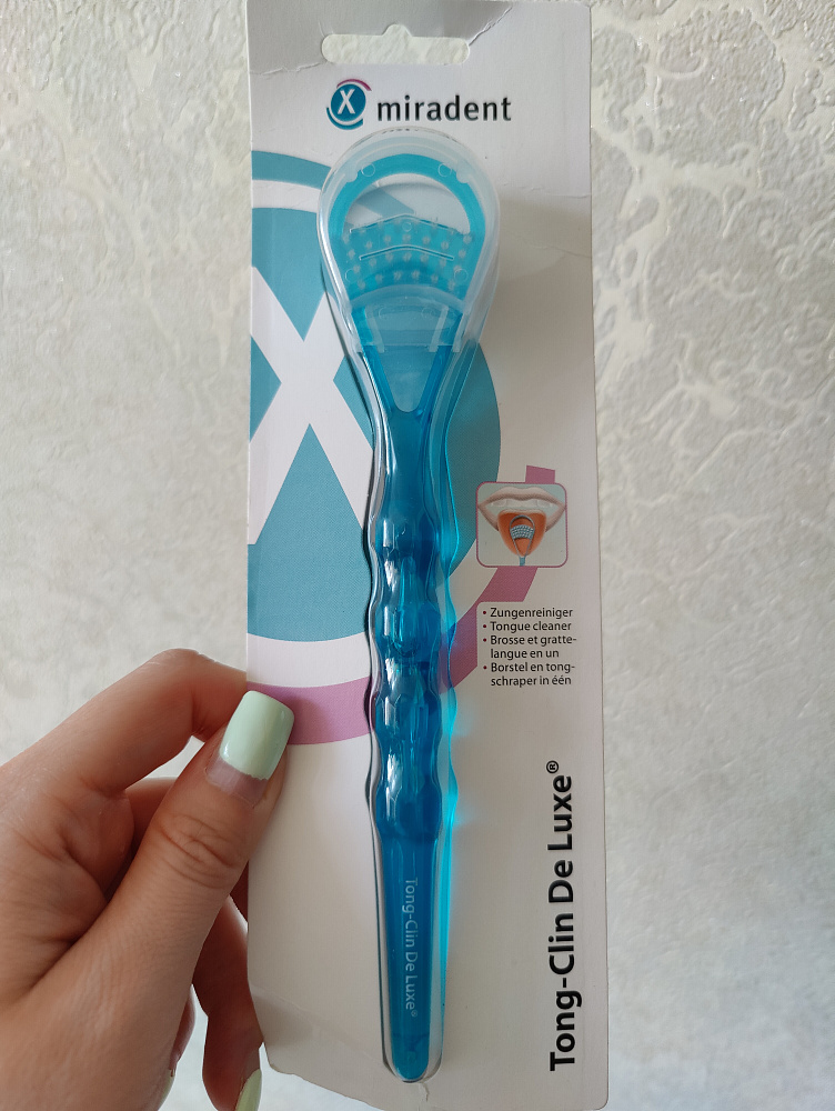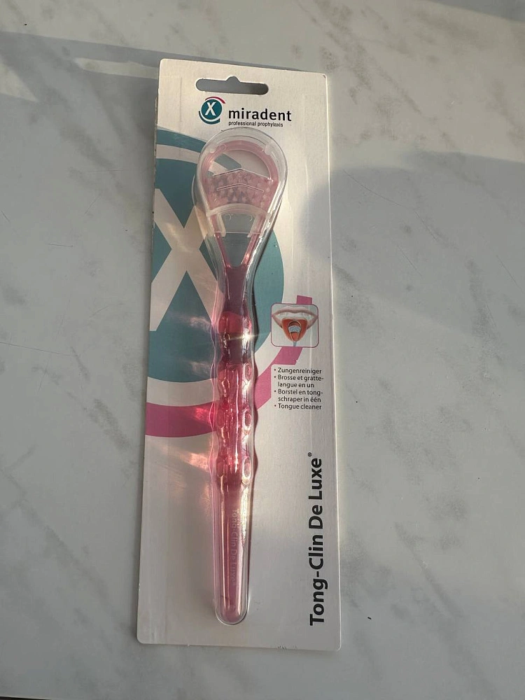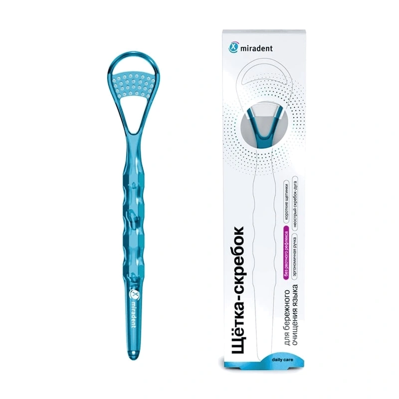 Причиной неприятного запаха изо рта, в 90 % случаев являются патологические процессы, происходящие в самой полости рта. Исследования этой проблемы показали, что неприятный запах часто бывает обусловлен бактериальным налетом на поверхности языка. Налет нарушает естественный баланс микрофлоры полости рта и способствует дальнейшему усугублению процесса вплоть до нарушения вкусовой чувствительности. Использование обычной зубной щетки не рекомендуется для очистки языка по гигиеническим и другим причинам (слишком длинные щетинки, рвотный рефлекс). Щетка miradent Tong-Clin® De Luxe для очистки языка с эргономичной ручкой особенно эффективна благодаря очень коротким щетинкам. Дуга и щетинки эффективно удаляют с языка налет. Также дуга не вызывает рвотный рефлекс.