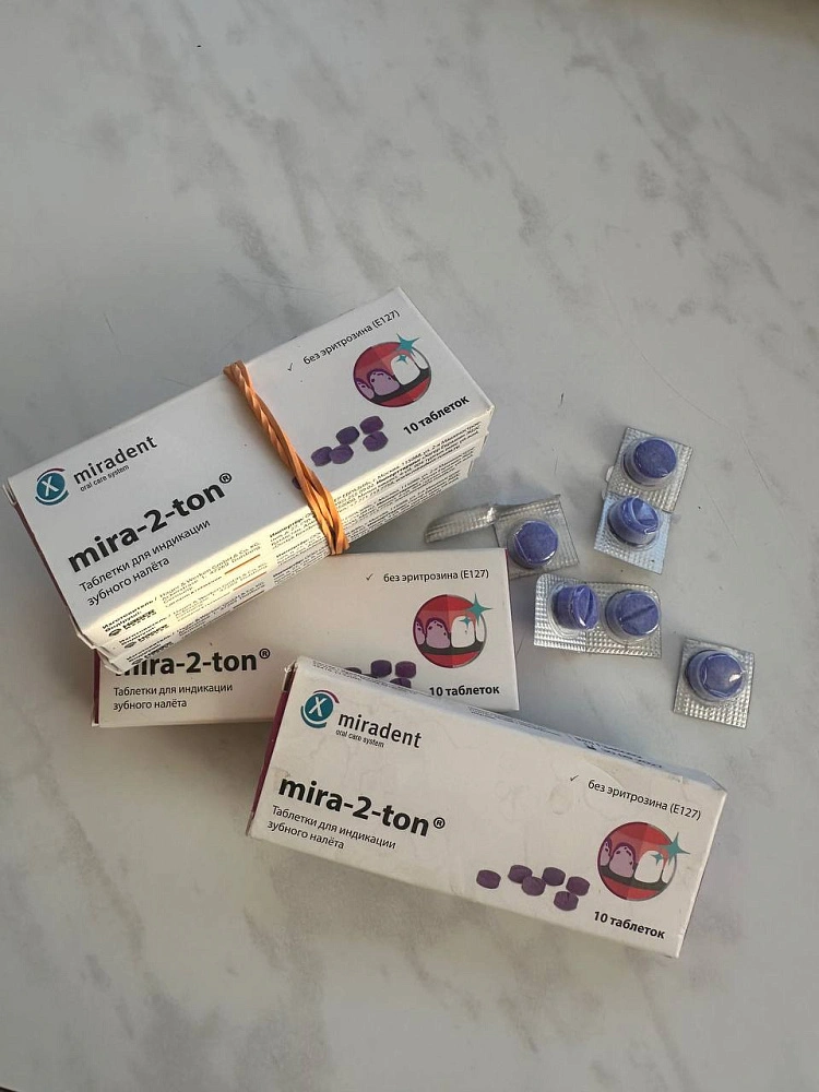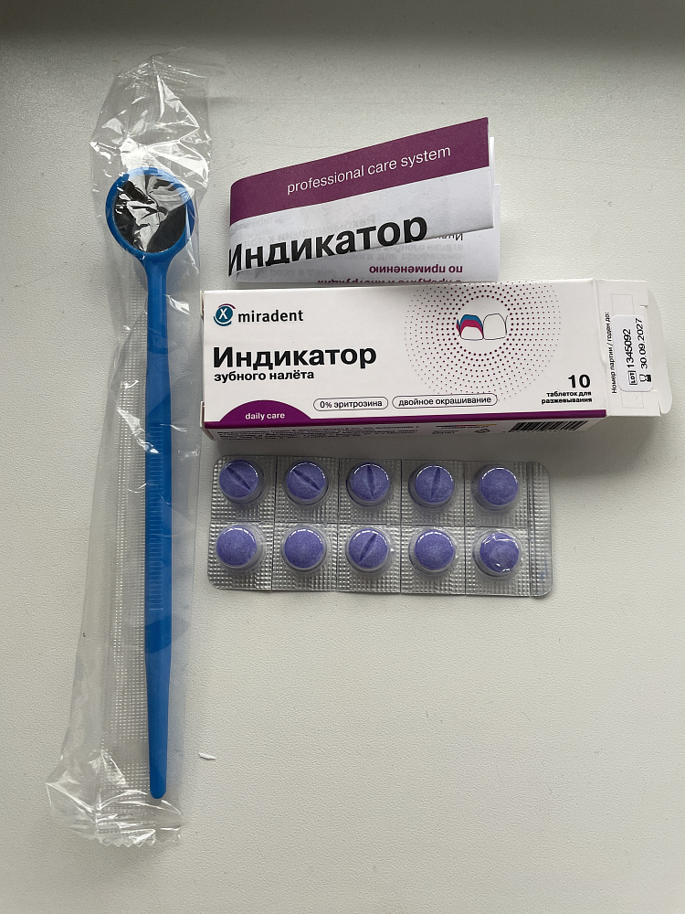 Инструкция по применению: Поместить 1/2 таблетки на язык и разжевать, распределить частицы таблетки по поверхности зубов. Старый налет окрасится в темно-синий цвет, более свежий - в розовый. Затем тщательно почистить зубы щеткой и флоссом для полного удаления окрашенного налета.