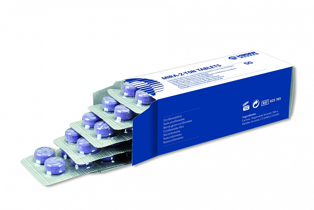 Таблетки для индикации зубного налёта miradent® Mira-2-Ton без содержания эритрозина. Окрашивание происходит с помощью пищевого красителя. В упаковке 50 таблеток.