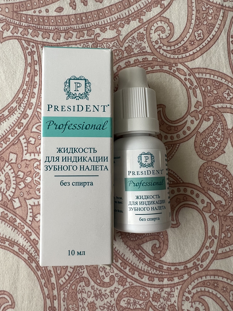 Индикатор зубного налета President Plaque Test предназначен как для профессионального использования в стоматологическом кабинете, так и для домашнего применения. Жидкость окрашивает старый налет бордовым цветом, новый налет - розовым. Пигмент легко удаляется при чистке зубной щеткой и пастой. Так как налетом покрыты также слизистые оболочки полости рта, возможно окрашивание языка, десен и губ. Через несколько часов пигментация исчезнет.