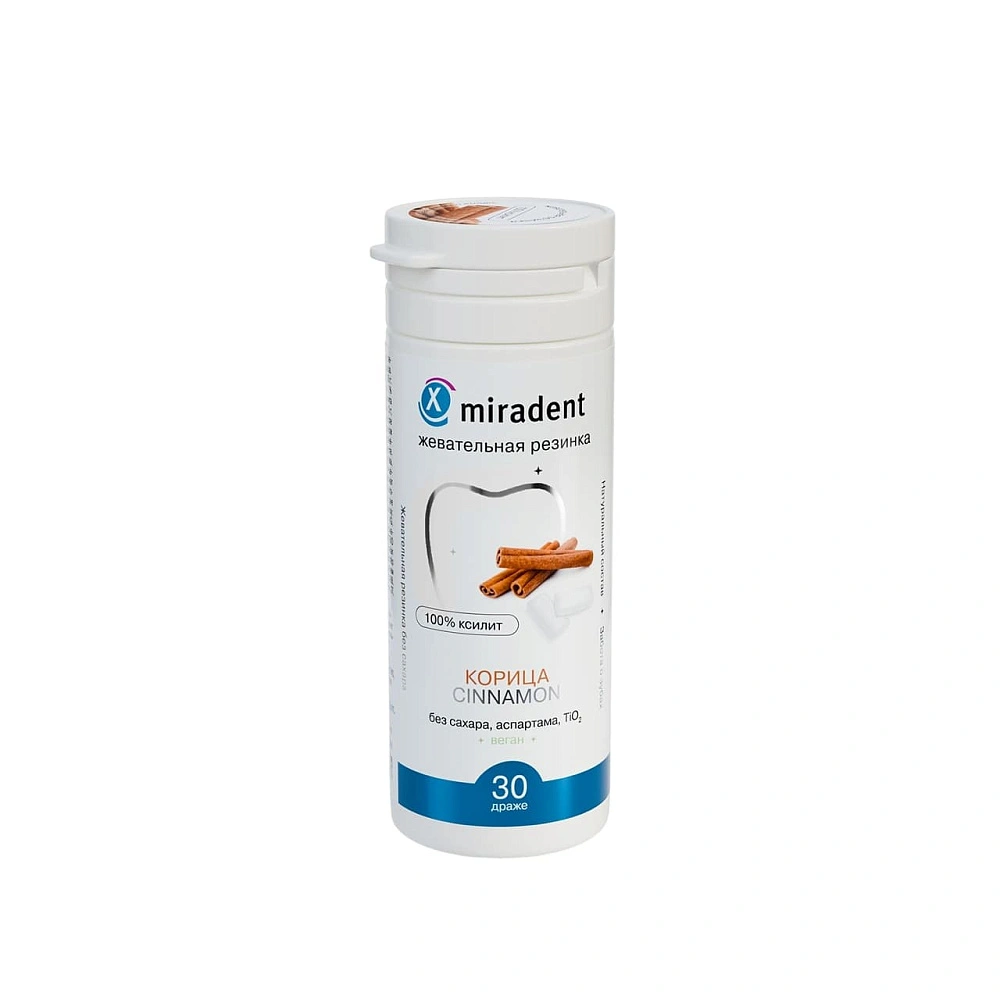 miradent® Xylitol Chewing Gum - медицинская жевательная резинка в удобных баночках по 30 подушечек, со вкусом корицы. Жевательная резинка с ксилитом имеет очищающее и предотвращающее налёт действие, эффективно блокирует образование кариеса, особенно после еды. Вся серия жевательных резинок Xylitol не содержит ни один из опасных искусственных заменителей сахара. В качестве подсластителя в Xylitol использован натуральный ксилит, получаемый из растительных компонентов и древесины лиственных пород В жевательной резинке miradent® Xylitol сахар на 100% заменяется ксилитом, вследствие чего она положительно влияет на здоровье, способствуя: