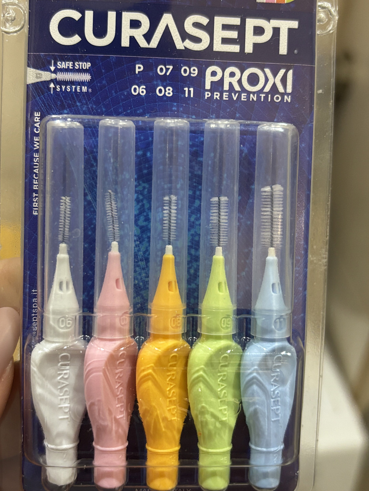 Набор CURASEPT PROXI MIX состоит из 5 ёршиков с диаметром стержня 0,6 мм; 0,7 мм; 0,8 мм; 0,9 мм и 1,1 мм.