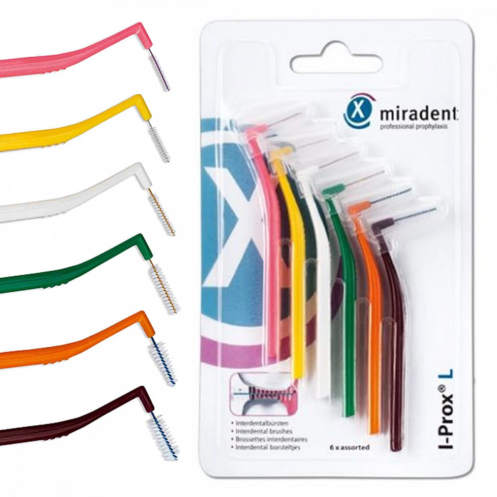 Набор межзубных ершиков miradent I-Prox L MIX включает в себя 6 ёршиков с ультрамягкой щетиной и проволочным стержнем со специальным покрытием. Ершики отличаются друг от друга густотой и длиной щетинок, длиной и диаметром стержня: