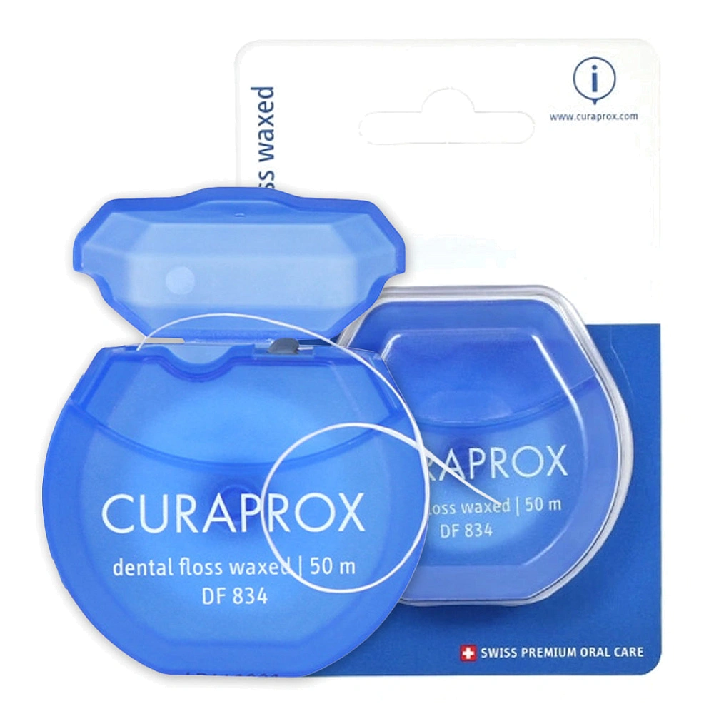 Вощеная межзубная нить Curaprox Dental Floss waxed DF 834 с мятным вкусом. Длина нити - 50 м.