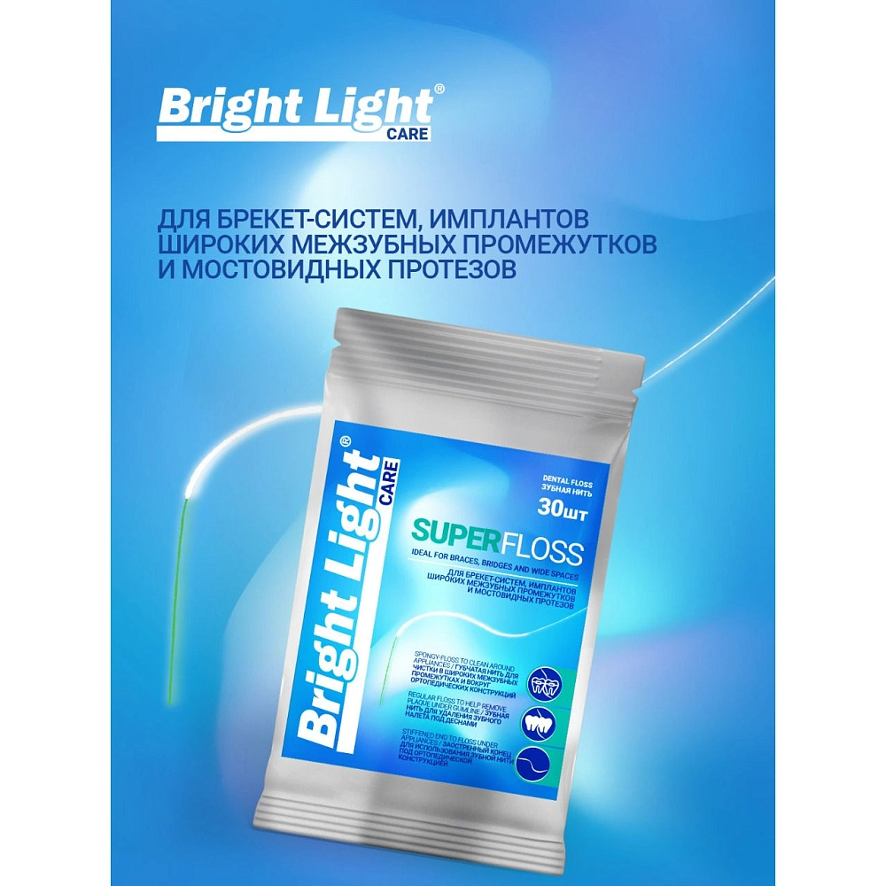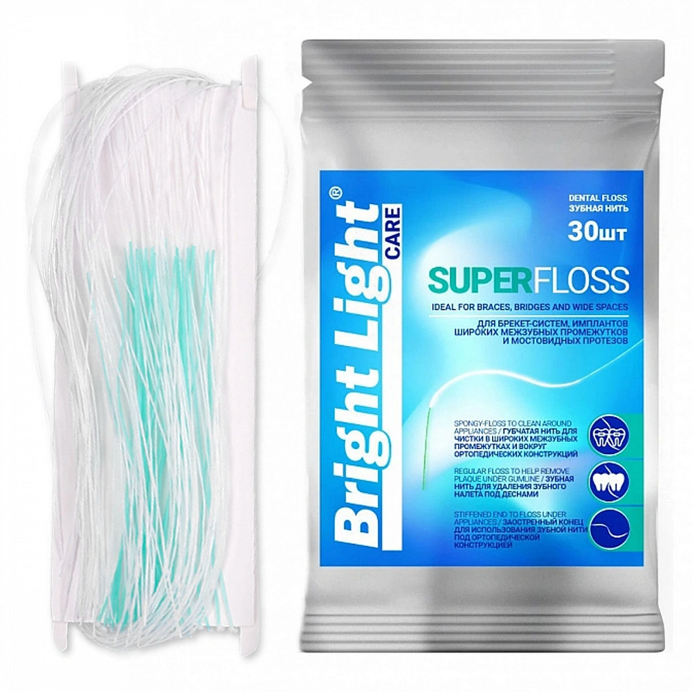 Зубная нить BRIGHT LIGHT Super Floss изготовлена из нейлона, что делает ее более прочной, по сравнению с нитями из натурального шелка. Super Floss предназначена для ухода за мостовидными протезами, коронками и брекет-системами.