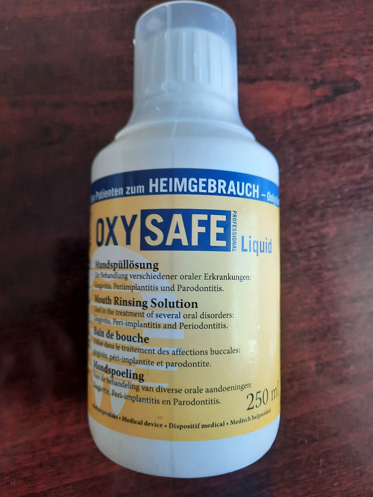 Меры предосторожности: OXYSAFE Liquid Professional нельзя использовать при наличии металла в полости рта (за исключением титана и титановых имплантатов), а также в период беременности и кормления грудью. Перед использованием ополаскивателя необходимо снять съемные протезы.