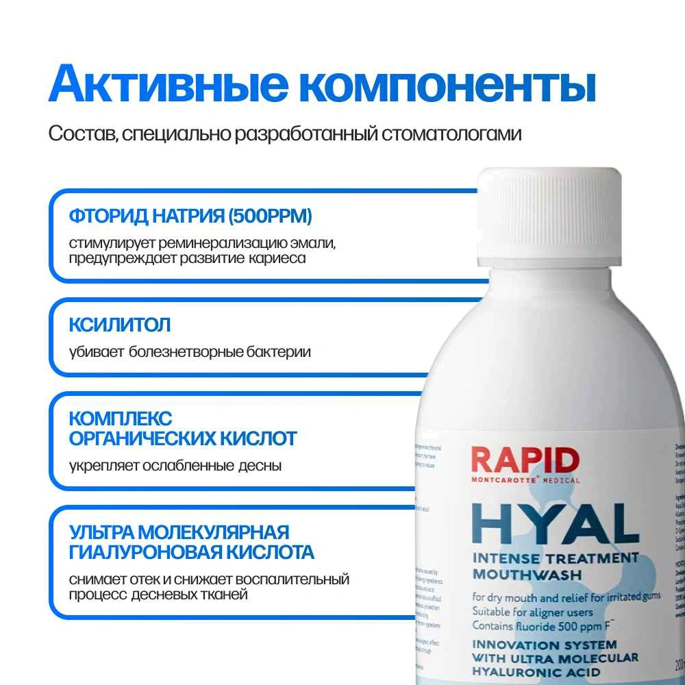 Ополаскиватель RAPID HYAL разработан специально стоматологами для защиты и поддержания увлажненности слизистой полости рта, рекомендована людям, имеющим проблему сухости во рту или при риске ее возникновения. Он также идеально подходит для пользователей элайнеров, ускоряет процесс адаптации мягких тканей к наличию кап в полости рта, эффективно очищает зубы и поверхность элайнеров, не вызывает раздражения слизистой и хорошо освежает полость рта.