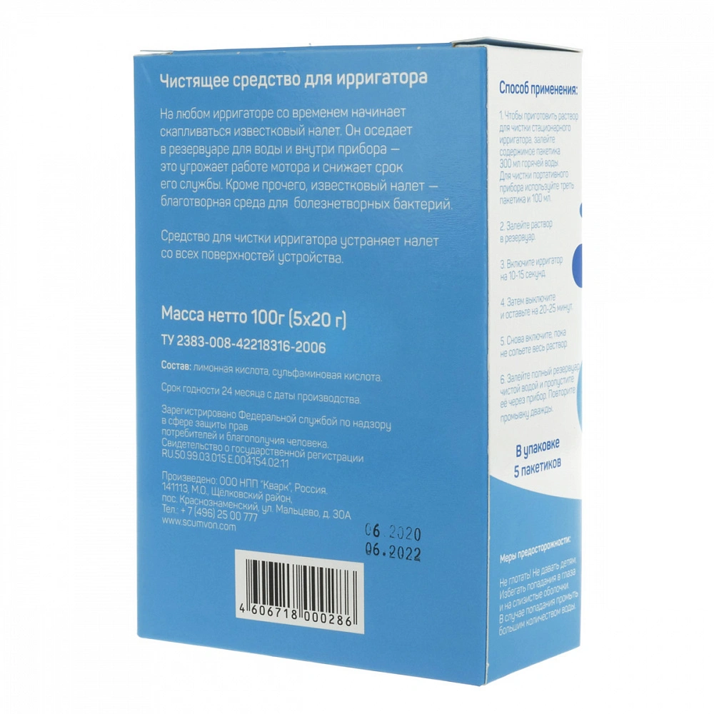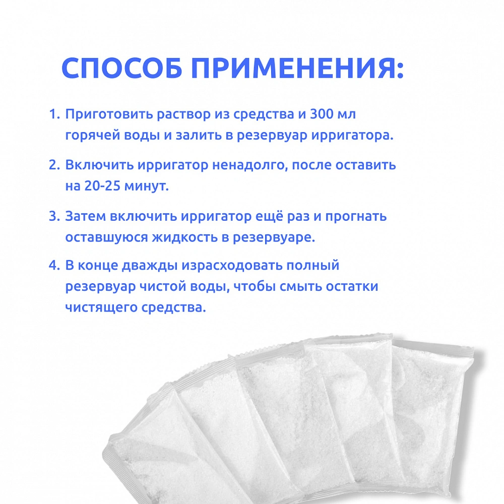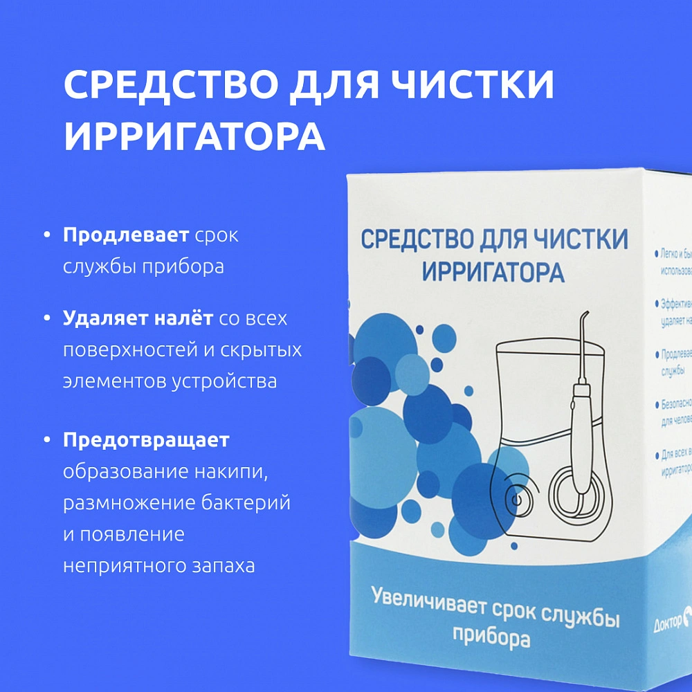 Внутри любого ирригатора по истечении некоторого времени начинают скапливаться известковый налет и прочие отложения. Налет накапливается как на резервуаре для воды, так и на внутренних поверхностях. Это затрудняет работу мотора и снижает срок службы прибора. Известковый налет также является благотворной средой для размножения болезнетворных бактерий и организмов. Средство для чистки ирригатора поможет удалить налет со всех поверхностей и скрытых элементов устройства.