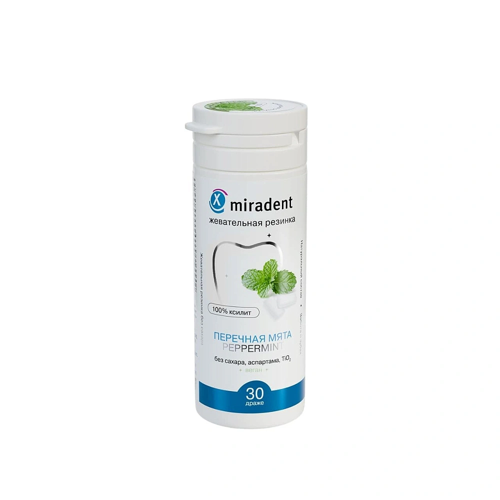 miradent® Xylitol Chewing Gum - медицинская жевательная резинка в удобных баночках по 30 подушечек, со вкусом перечной мяты. Жевательная резинка с ксилитом имеет очищающее и предотвращающее налёт действие, эффективно блокирует образование кариеса, особенно после еды. Вся серия жевательных резинок Xylitol не содержит ни один из опасных искусственных заменителей сахара. В качестве подсластителя в Xylitol использован натуральный ксилит, получаемый из растительных компонентов и древесины лиственных пород.