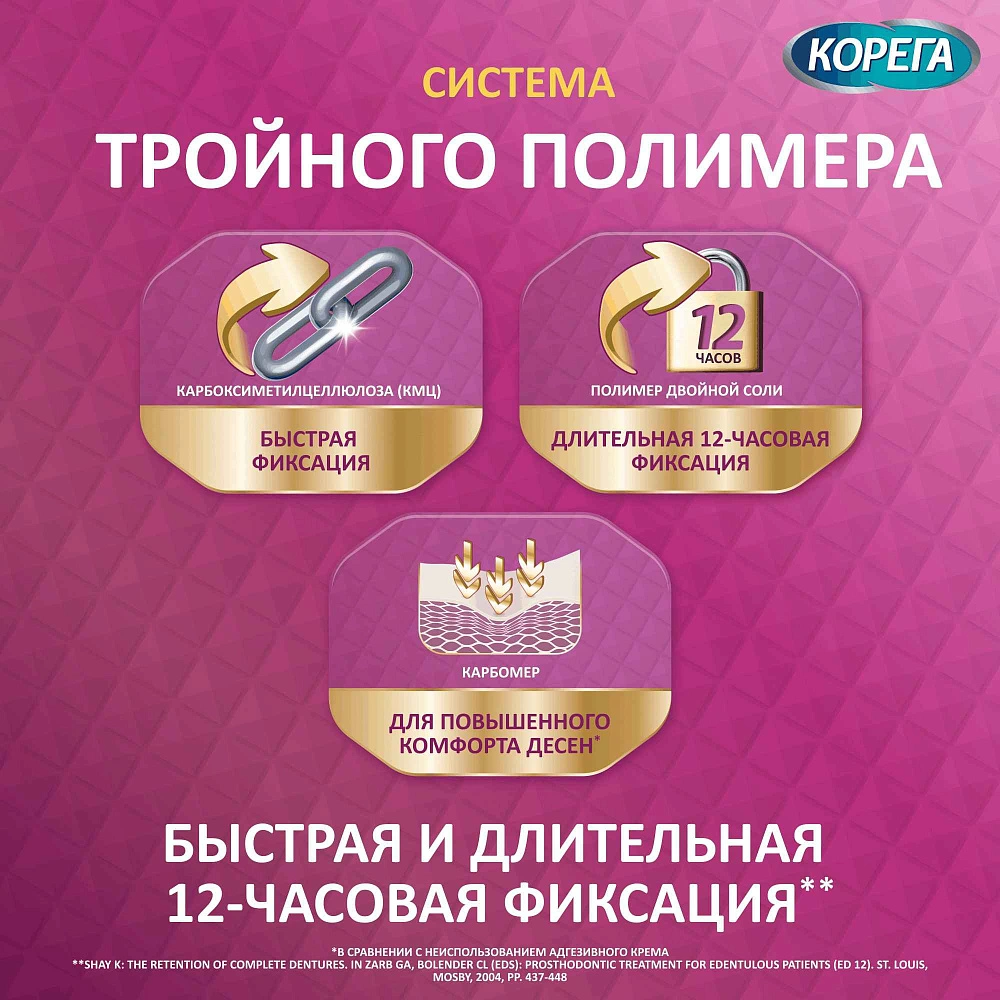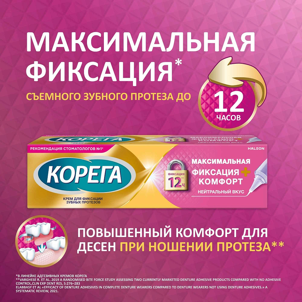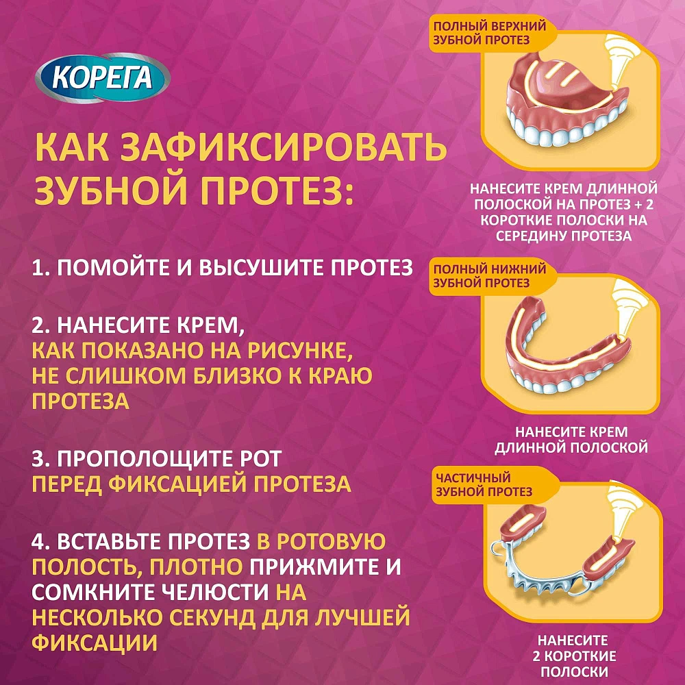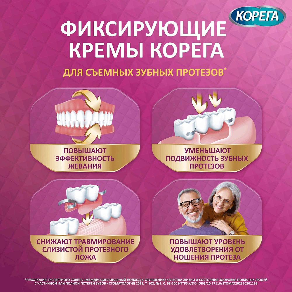 КОРЕГА — крем для надежной фиксации зубных протезов. Продукт разработан для обеспечения максимального комфорта и уверенности в течение всего дня.