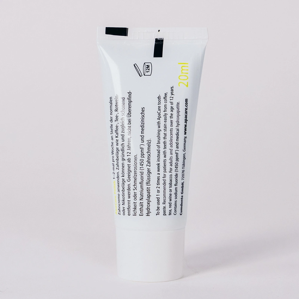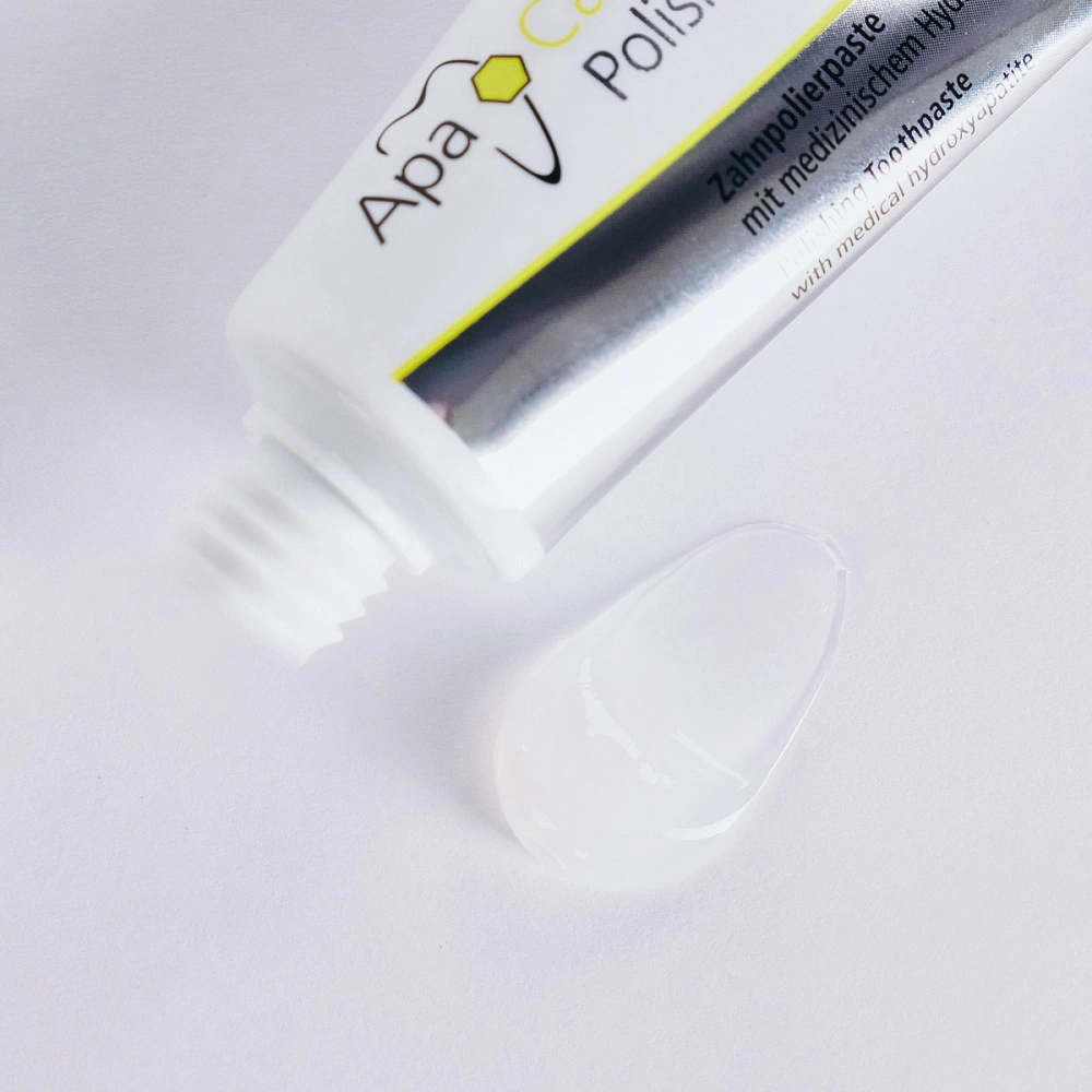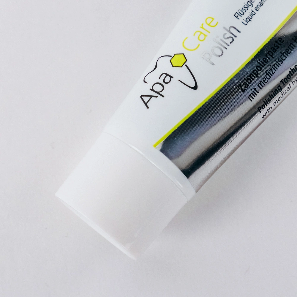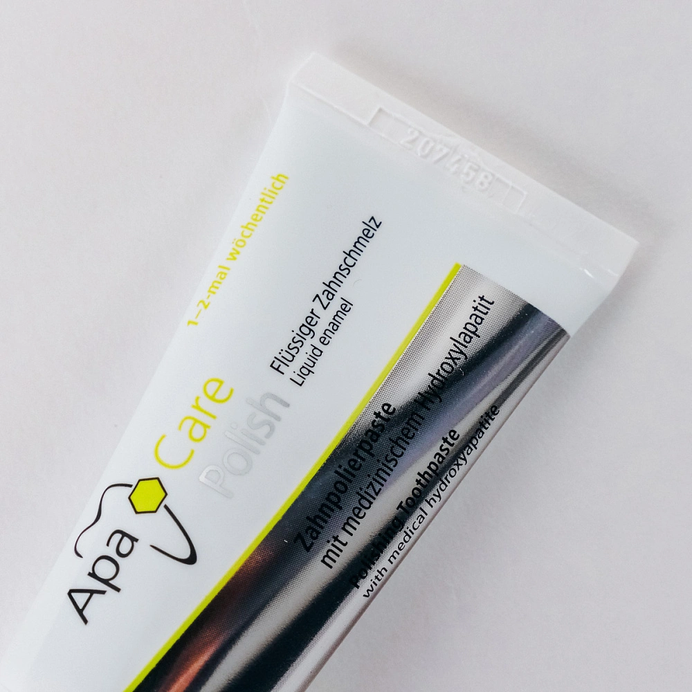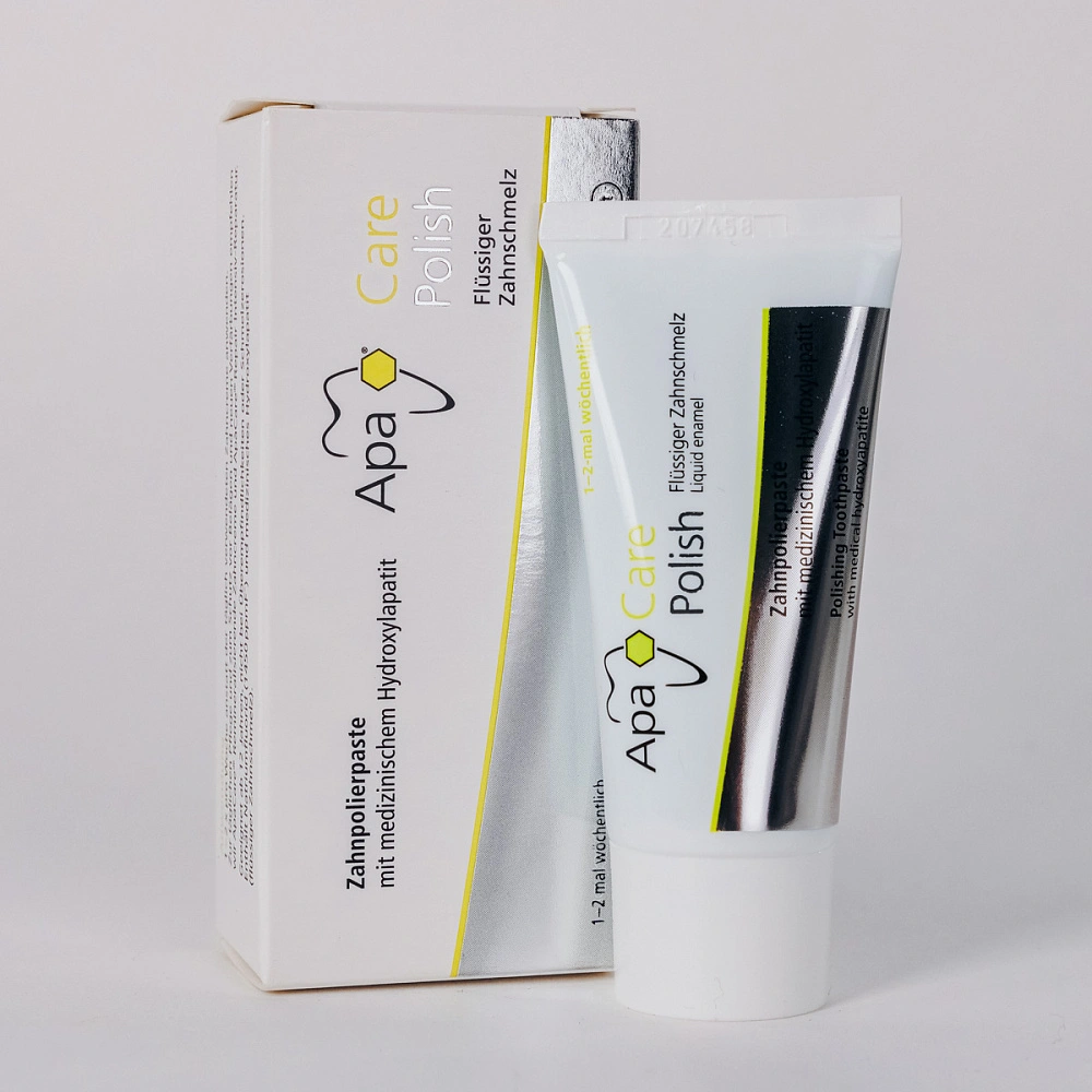 Основу линейки укрепляющих препаратов ApaCare составляет уникальный комплекс «Жидкая эмаль», который содержит медицинский гидроксиапатит. Состав полирующей пасты обогащен 3% наногидроксиапатитом, который защищает зубы от повышенной чувствительности, отбеливает и полирует их поверхность, а также фторидом натрия (1450 ppm) для борьбы с кариесом. Полирующая зубная паста используется 1-2 раза в неделю вместо чистки зубов обычной пастой. При применении продуктов серии ApaCare создается эффект гладкой и скользкой эмали, с характерным блеском зубов и легким отбеливающим до естественной белизны эффектом.