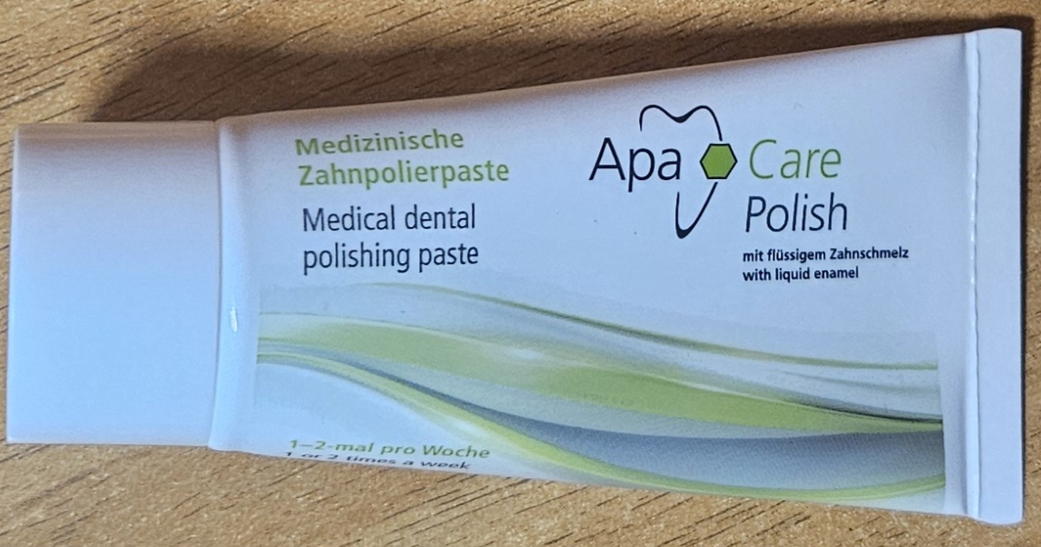 Основу линейки укрепляющих препаратов ApaCare составляет уникальный комплекс «Жидкая эмаль», который содержит медицинский гидроксиапатит. Состав полирующей пасты обогащен 3% наногидроксиапатитом, который защищает зубы от повышенной чувствительности, отбеливает и полирует их поверхность, а также фторидом натрия (1450 ppm) для борьбы с кариесом. Полирующая зубная паста используется 1-2 раза в неделю вместо чистки зубов обычной пастой. При применении продуктов серии ApaCare создается эффект гладкой и скользкой эмали, с характерным блеском зубов и легким отбеливающим до естественной белизны эффектом.