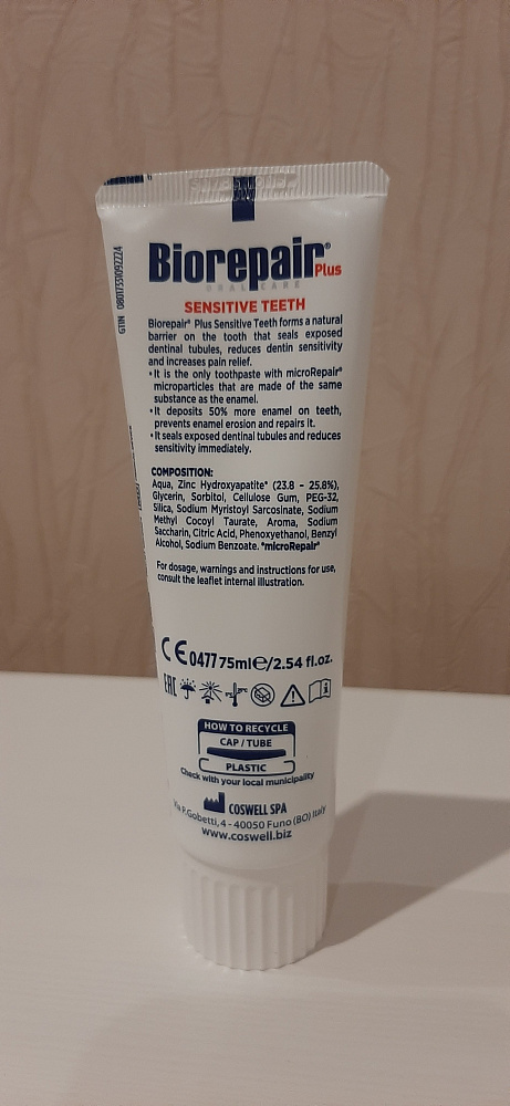 Biorepair Denti Sensibili PLUS – реминерализирующая зубная паста, которая запечатывает открытые дентинные канальцы и быстро снижает чувствительность зубов. Продукты Biorepair содержат в составе активное вещество MicroRepair - микрокристаллы медицинского гидроксиапатита (цинк-замещенный-карбонат-гидроксиапатит). Он аналогичен естественному гидроксиапатиту, который входит в состав костей и зубов и составляет 96% зубной эмали. Кристаллы MicroRepair соединяются с эмалью и восстанавливают ее структуру, усиливая естественную защиту зубов. Паста снижает чувствительность зубов, так как гидроксиапатит запечатывает открытые дентинные канальцы, через которые проникают внешние раздражители, вызывающие боль.
