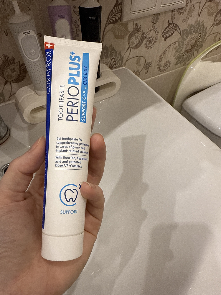 Зубная паста Curaprox PerioPlus+ SUPPORT на основе хлоргексидина 0,09 % с комплексом биофлавоноидов CITROX, фторидом натрия (230 ppm) и гиалуроновой кислотой.