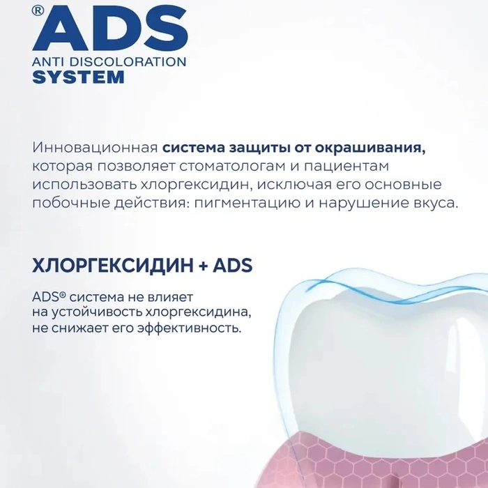 Инновационная и клинически протестированная система A.D.S.® (Anti Discoloration System) от бренда Curasept уменьшает появление желто-коричневых пятен на зубах, являющихся основным побочным эффектом хлоргексидина и сохраняет вкусовую чувствительность. Состав без спирта, SLS, ПАВ и парабенов. Это помогает сохранить результативность применения хлоргексидина.