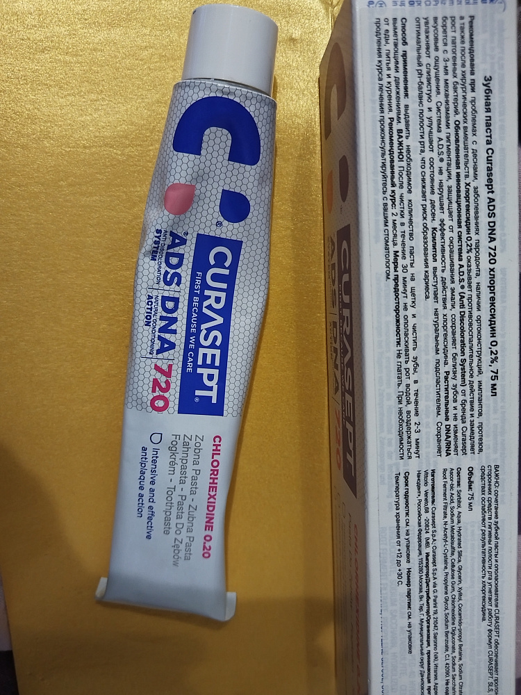 Зубная паста Curasept ADS 720 содержит 0,20% хлоргексидина биглюконата. Зубные пасты Curasept рекомендуется использовать во всех случаях, когда используются средства для полоскания полости рта с хлоргексидином. При применении таких ополаскивателей не должны использоваться зубные пасты, содержащие лаурилсульфат натрия, так как он нейтрализует действие хлоргексидина. Зубную пасту Curasept ADS 720 рекомендуется использовать с ополаскивателем Curasept ADS 220.