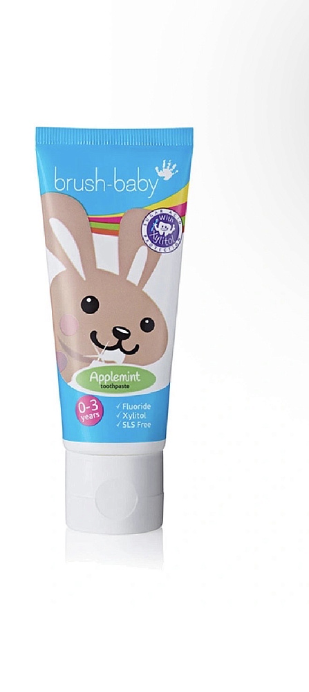 Детская зубная паста Brush-Baby со вкусом яблока и мяты разработана специально для чистки первых зубов. Подходит детям до 3 лет.