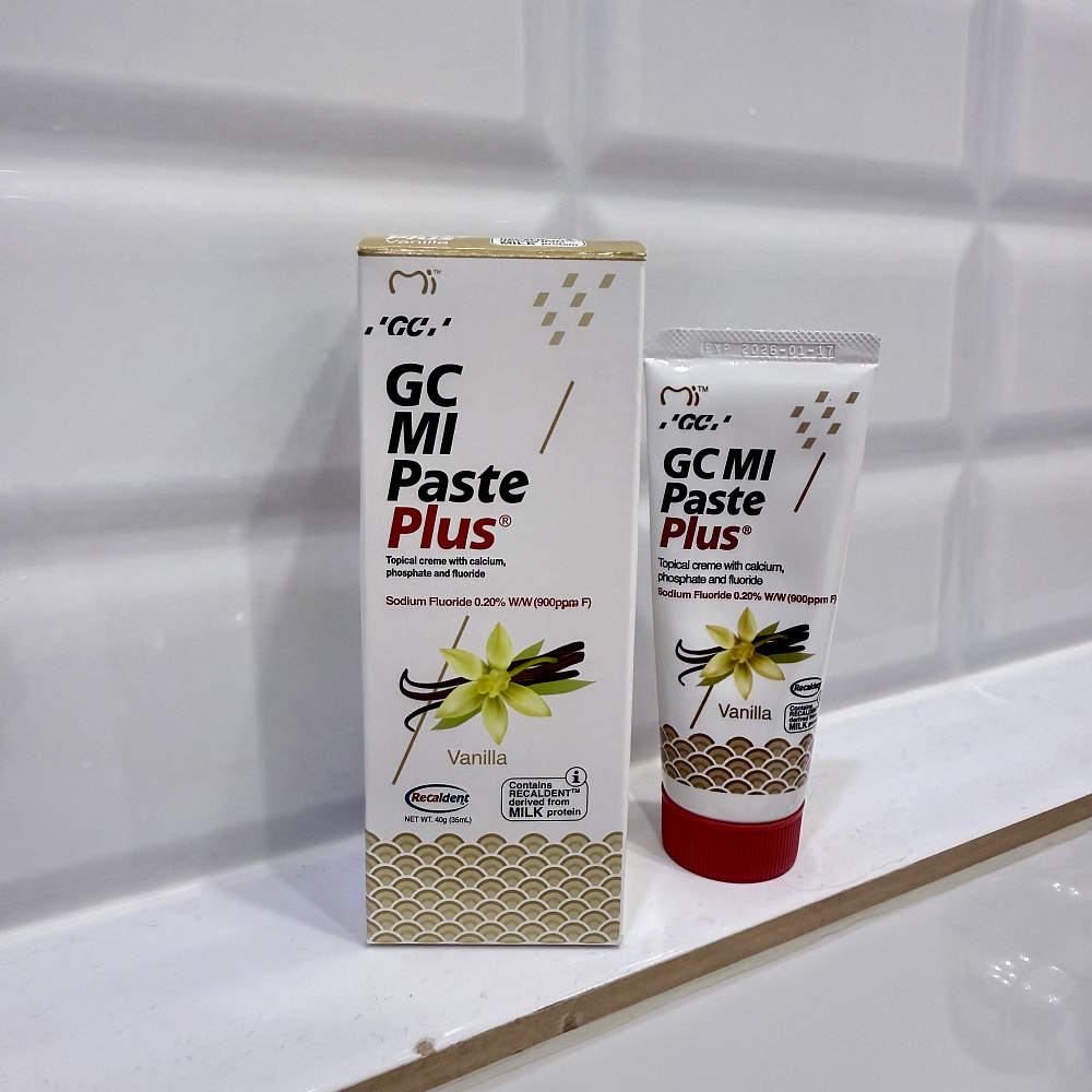 Гель Mi Paste Plus отличается от Tooth Mousse тем, что содержит в составе фтор. Концентрация фторида составляет 0,2 % (900 ppm), что приблизительно соответствует его концентрации в обычных зубных пастах для взрослых. GC MI Paste Plus позволяет не просто восстанавливать гидроксиапатит, а строить в эмали гидроксифторапатит, который лучше противостоит вредному воздействию кислот. Профилактический эффект от применения Mi Paste Plus выше, но из-за высокого содержания фтора этот гель не рекомендуется использовать детям в возрасте до 6 лет, а детям до 12 лет — на ночь с капами из-за возможного проглатывания.