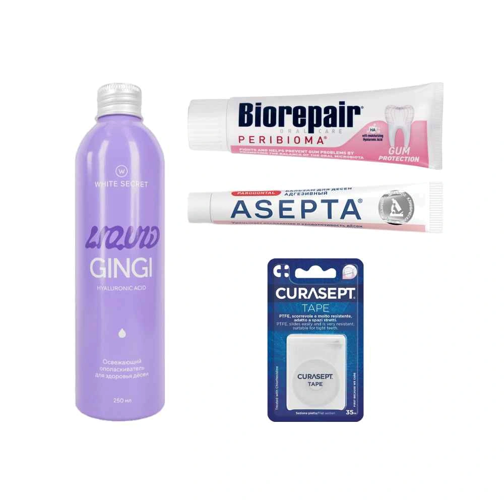Зубная паста Biorepair Peribioma Gum Protection; Бальзам адгезивный Асепта Parodontal; Ополаскиватель White Secret Liquid Gingi; Зубная нить Curasept PTFE Tape Dental Flos CHX 0