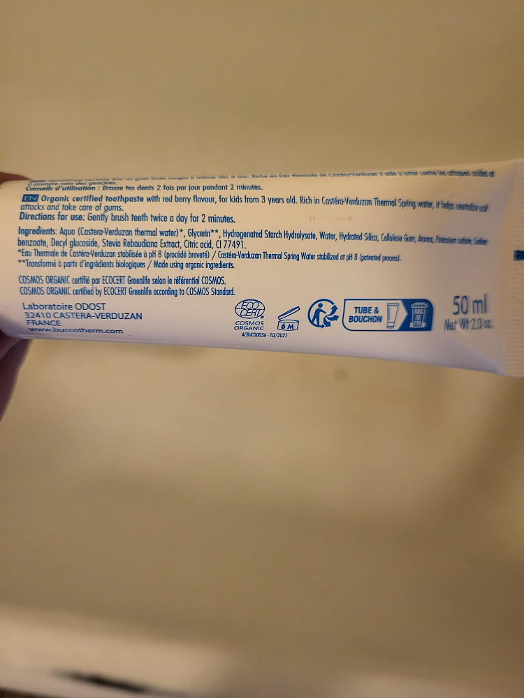 Детская зубная гель-паста Buccotherm создана для укрепления и заботы о здоровье полости рта ребенка. Содержит 51% уникальной термальной воды Castéra-Verduzan, насыщенной минеральными солями и полезными микроэлементами, которые необходимы для укрепления тонкой эмали молочных зубов. Активные вещества в составе оказывают противовоспалительное и антисептическое действие. Натуральный вкус лесных ягод привлекает ребенка к чистке зубов и надолго освежает дыхание.