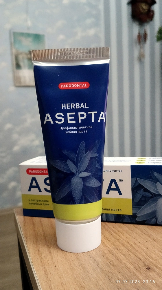 Зубная паста «ASEPTA» Лечебные травы – это профилактическое средство для ухода за полостью рта, содержащее экстракты лечебных трав и специализированную ферментативную систему для борьбы с зубным налетом. Она обеспечивает надежную защиту десен и зубов, способствуя их здоровью и благополучию.