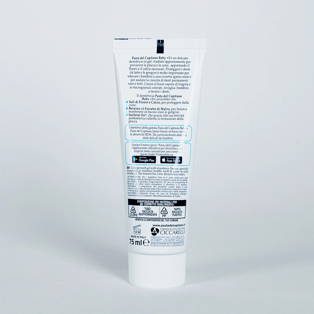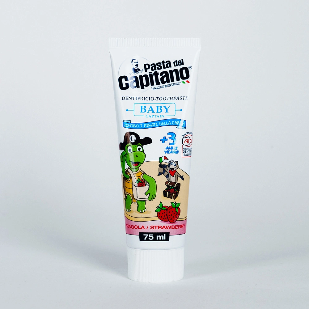 Детская паста Pasta del Capitano Baby содержит монофторфосфат натрия в концентрации 496 ppm и кальций, что помогает эффективно бороться с кариесом молочных зубов. Молекула сульфат цинка оказывает антибактериальное действие и замедляет образование зубного налёта. Бетаин и экстракт мальвы успокаивают, питают и поддерживают дёсны в здоровом состоянии.