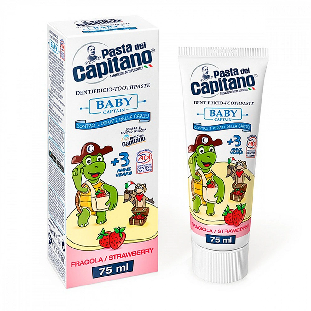 Детская зубная паста Pasta del Capitano Baby Strawberry для малышей от 3-х лет с разноцветными микрогранулами и ароматным вкусом клубники превратит ежедневную чистку зубов в интересное и увлекательное занятие. Благодаря низкой абразивности (RDA 24) паста бережно очищает молочные зубы, не повреждая эмаль.