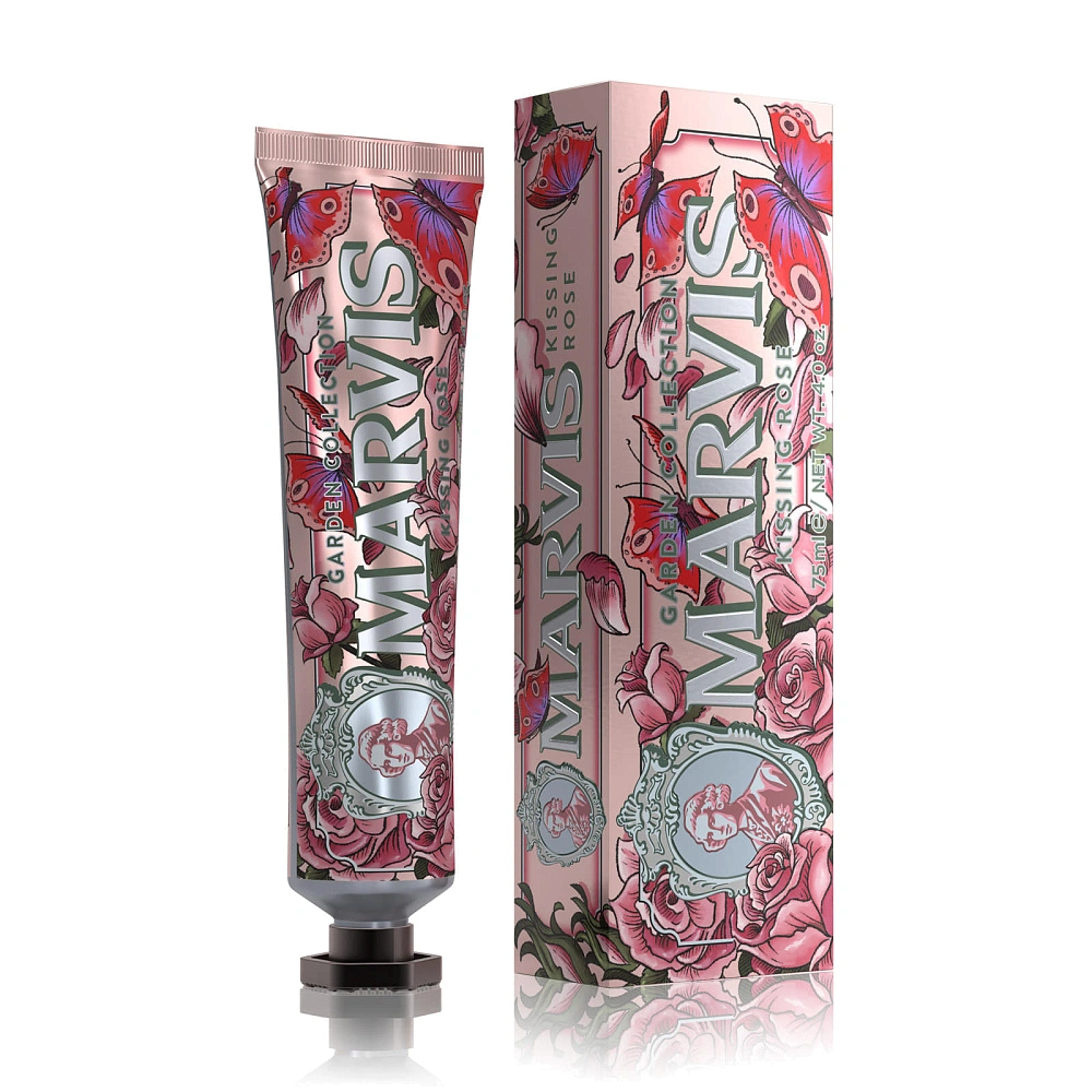 Возвышенный вкус зубной пасты Marvis Kissing Rose, вдохновленный миром авторской парфюмерии. Романтический аромат, наполняющий улыбку благоухающими нотами болгарской розы и свежим оттенком мяты.