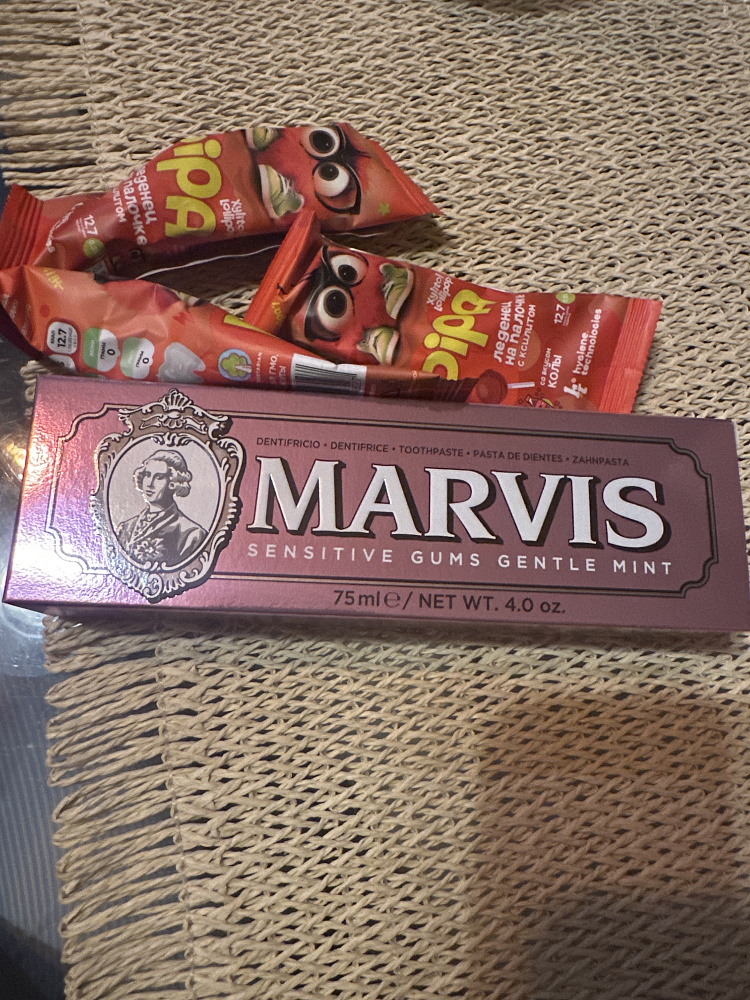 Зубная паста для чувствительных десен Sensitive Gums Gentle Mint итальянской марки Marvis имеет тонкий, нежный и освежающий мятный вкус. Деликатная консистенция образует небольшую плотную пенку, бережно и тщательно удаляет с ротовой полости бактериальный налёт, остатки пищи, улучшает состояние зубов и дёсен: укрепляет эмаль, предотвращает появление и развитие кариеса, имеет противовоспалительные и успокаивающие свойства, служит профилактикой заболеваний десен, снижает их чувствительность, укрепляет и устраняет кровоточивость. Результат можно заметить уже после первого использования.