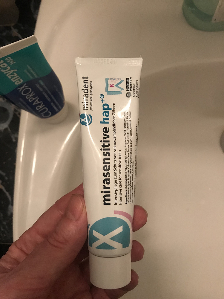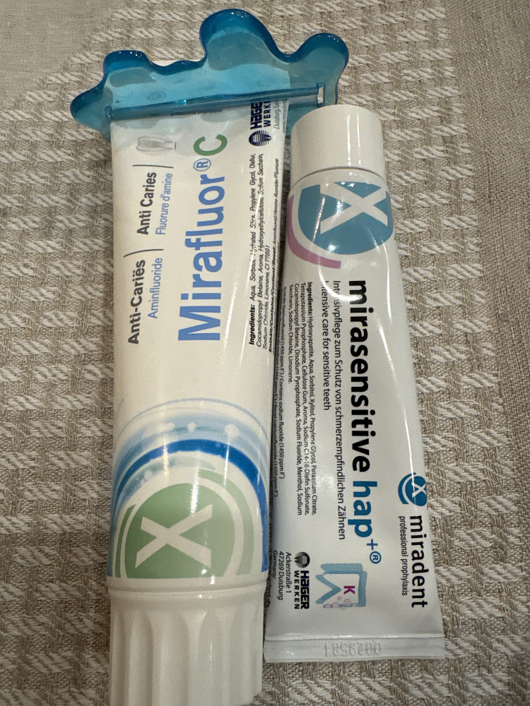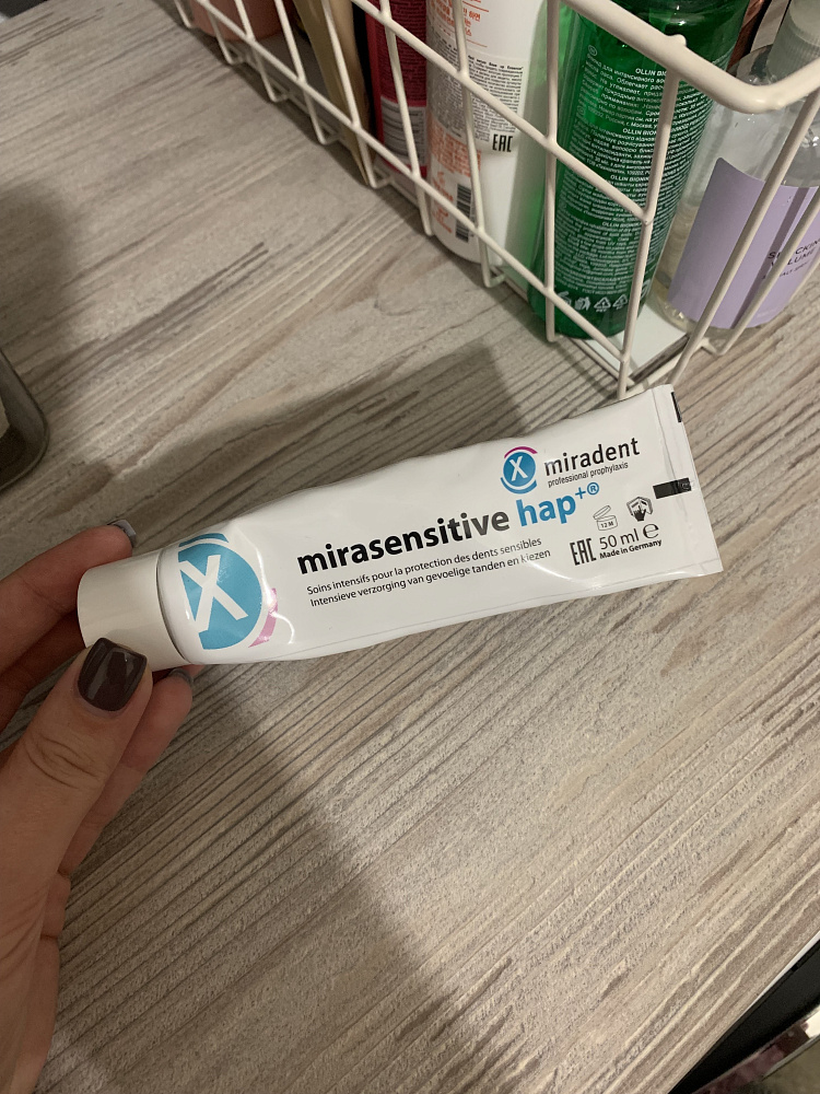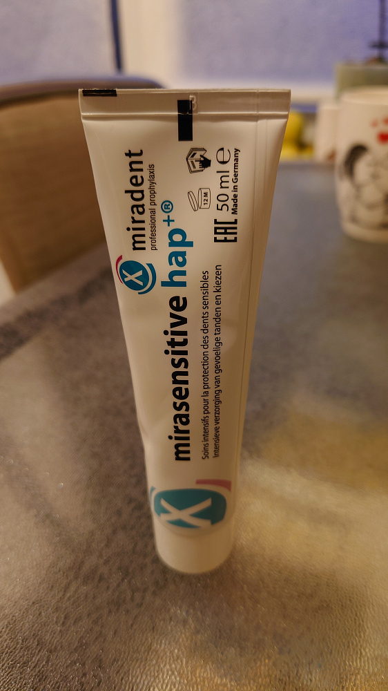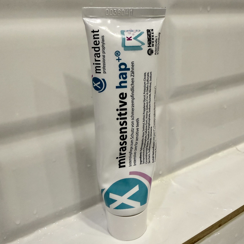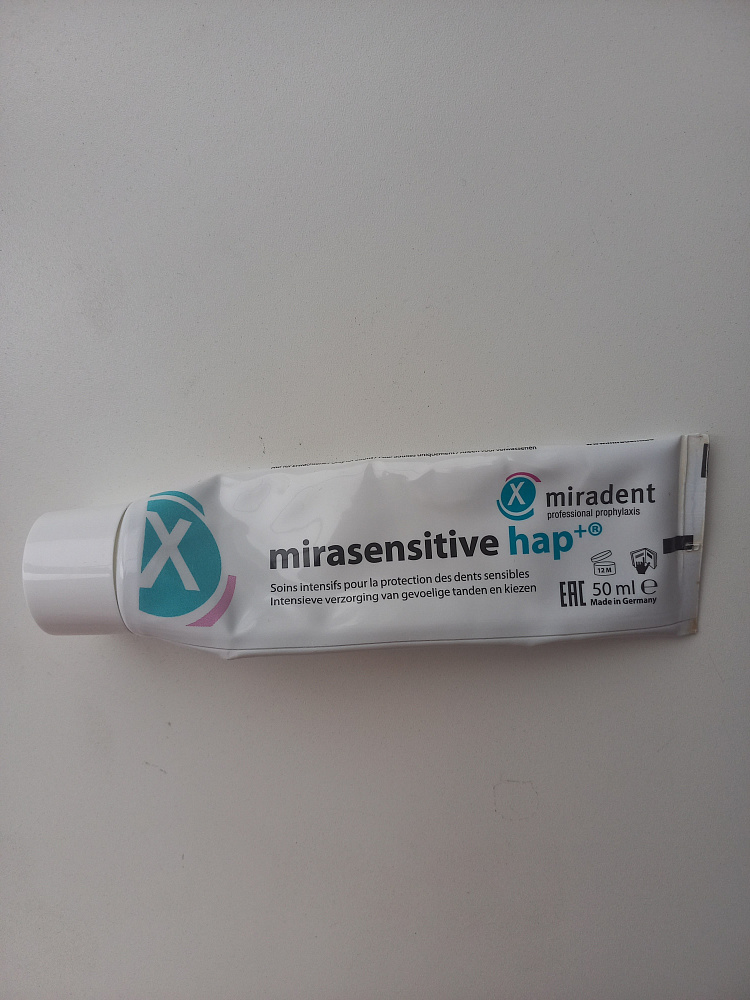 Зубная паста miradent mirasensitive hap+® с дуокомплексом hap+ устраняет причину гиперчувствительности зубов. 5% цитрат калия проникает через дентинные канальцы и анестезируют зубной нерв. 30% гидроксиапатит запечатывает открытые канальцы дентина и перекрывает поток раздражителей к нерву.