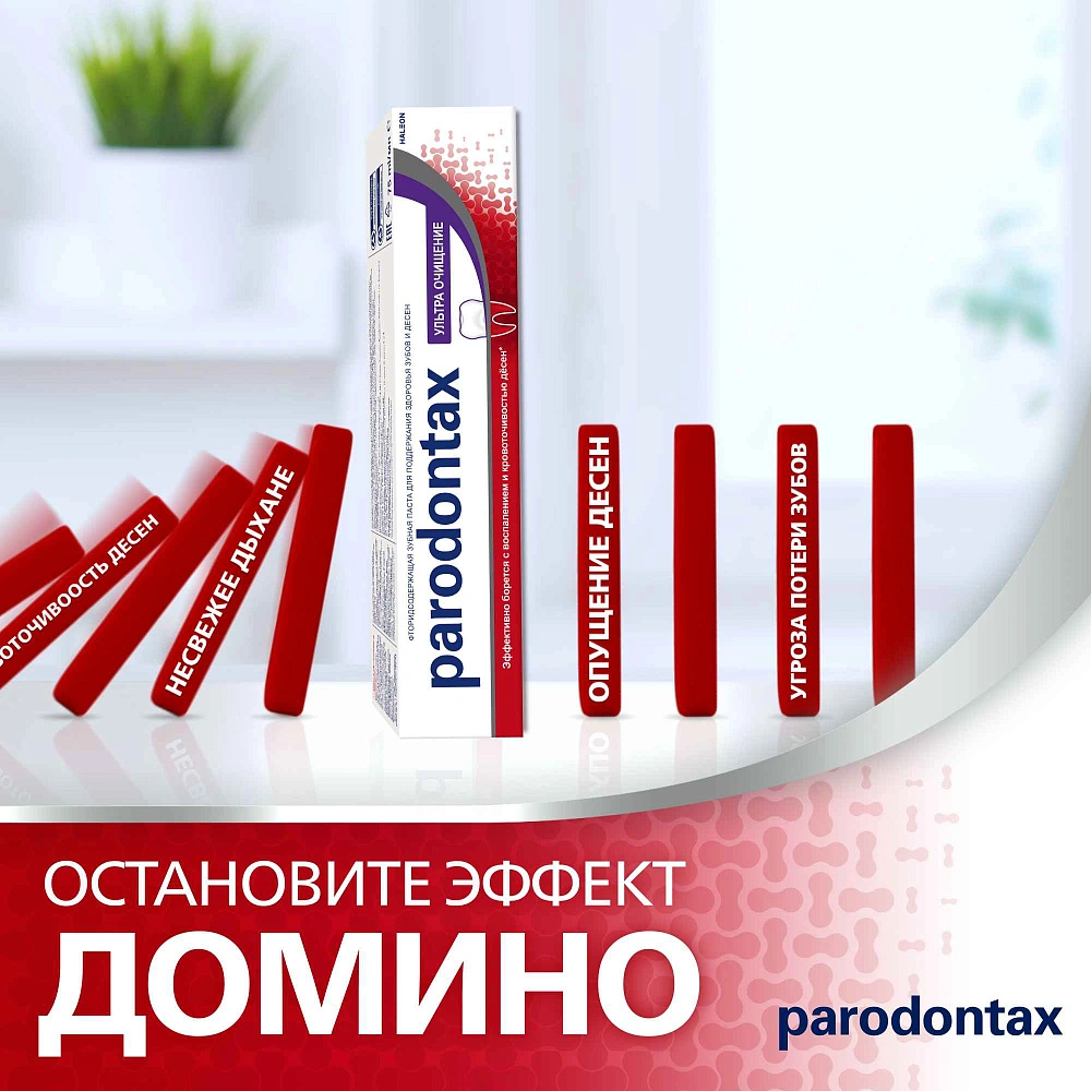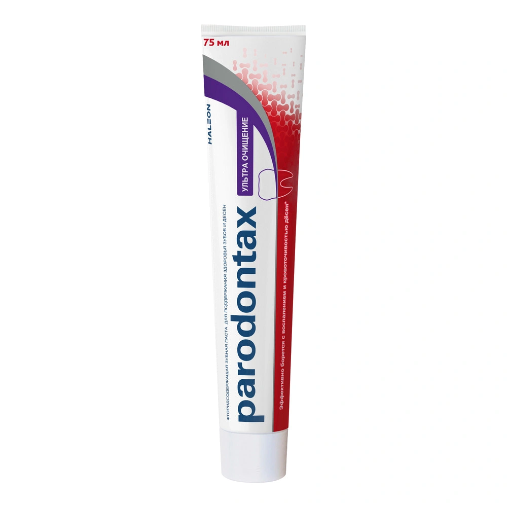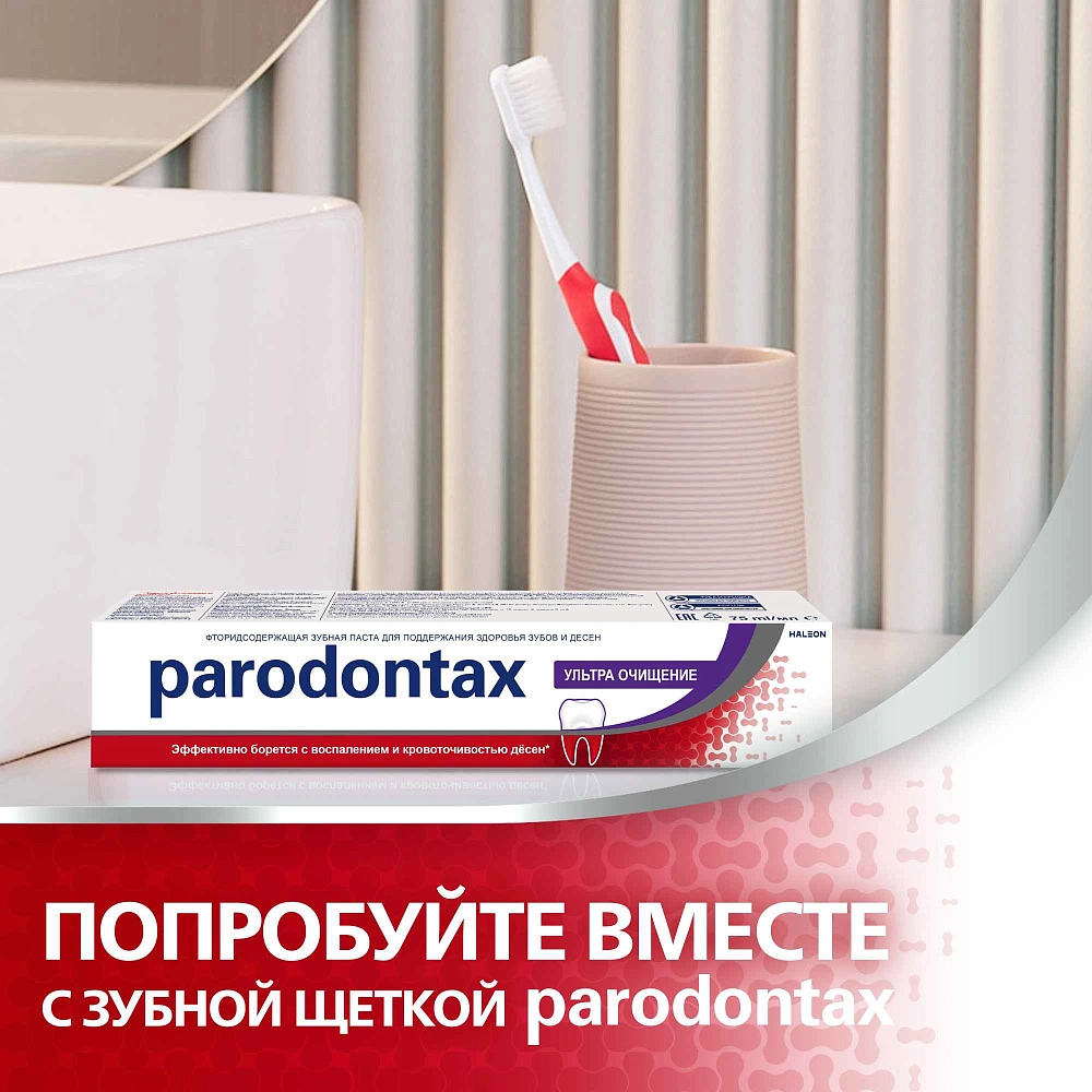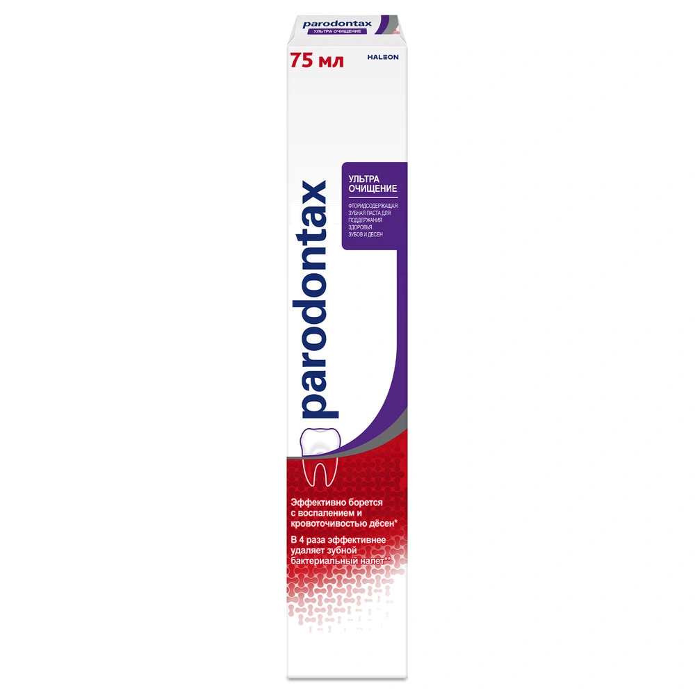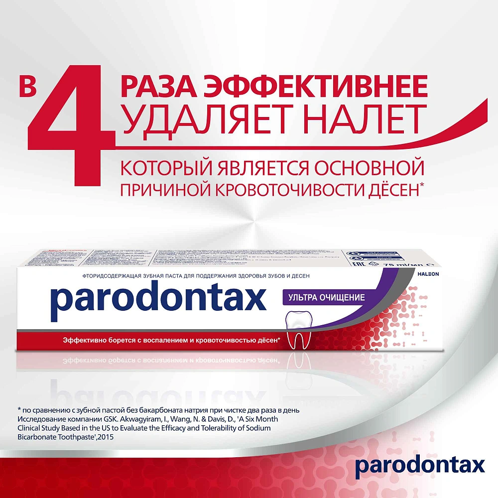 Зубная паста Parodontax Ультра Очищение активно борется с бактериями, вызывающими воспаление и кровоточивость десен, одновременно защищая зубы от кариеса благодаря фтору. Специальная формула обеспечивает тщательное очищение поверхности зубов без повреждения эмали.