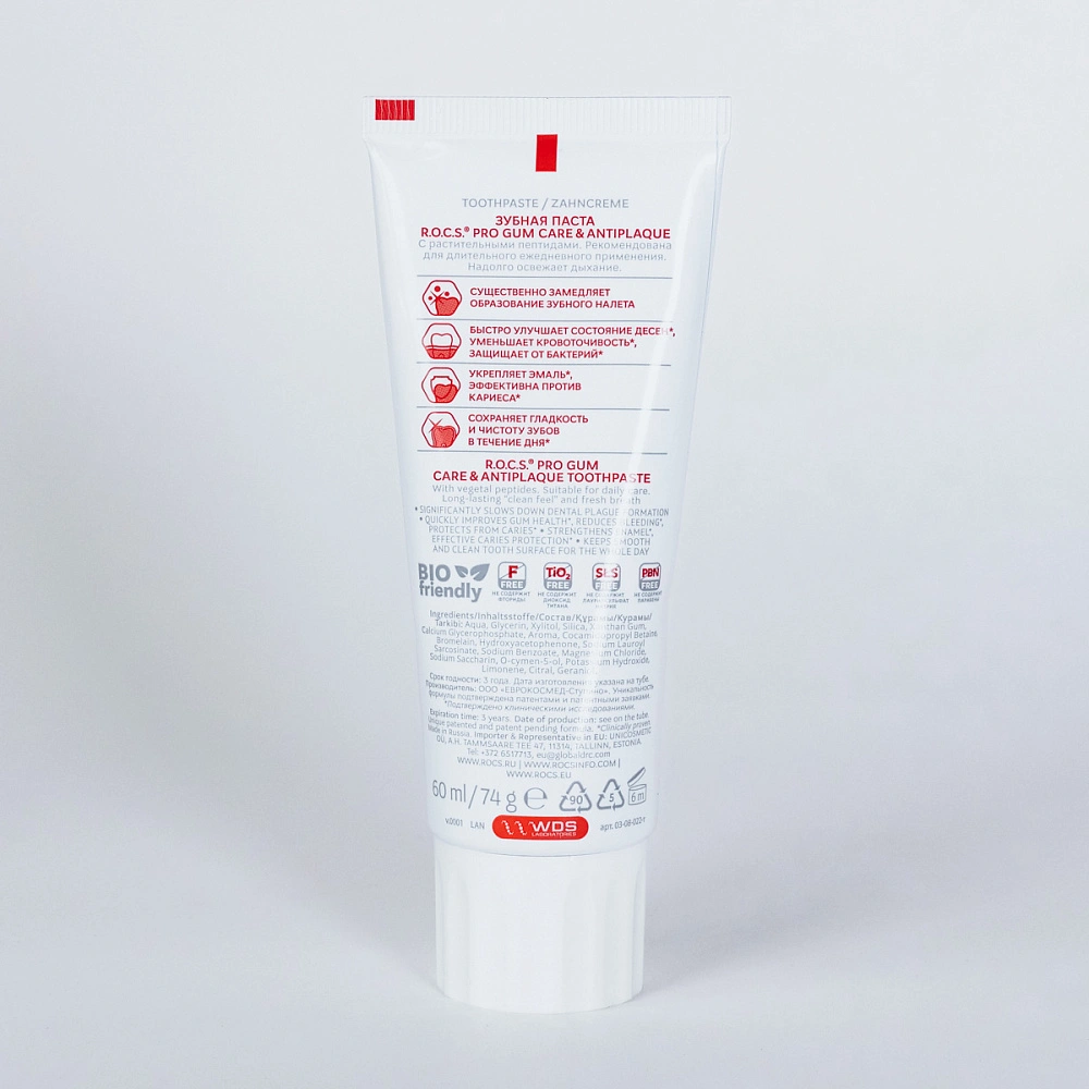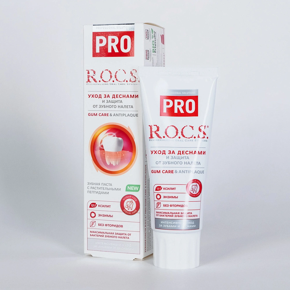 Уникальная лечебно-профилактическая зубная паста R.O.C.S. PRO GUM CARE & ANTIPLAQUE с высоким содержанием бромелаина и ксилита при регулярном ежедневном использовании существенно улучшает гигиеническое состояние полости рта, нормализует микрофлору полости рта, снижает скорость образования бактериального налета, устраняя факторы воспаления и обеспечивая длительную чистоту зубов и десен.