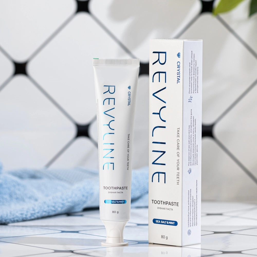 Revyline Crystal Морская соль и мята — зубная паста с освежающим морским ароматом и нотками мяты, обеспечивающая комплексный уход за полостью рта. Благодаря гидроксиапатиту и ксилиту укрепляет эмаль и защищает от кариеса, растительные ферменты и диоксид кремния эффективно удаляют налёт, а цитрат цинка и эссенция морской соли дарят длительную свежесть дыхания. Не содержит фторидов и SLS, имеет оптимальную абразивность RDA 70.