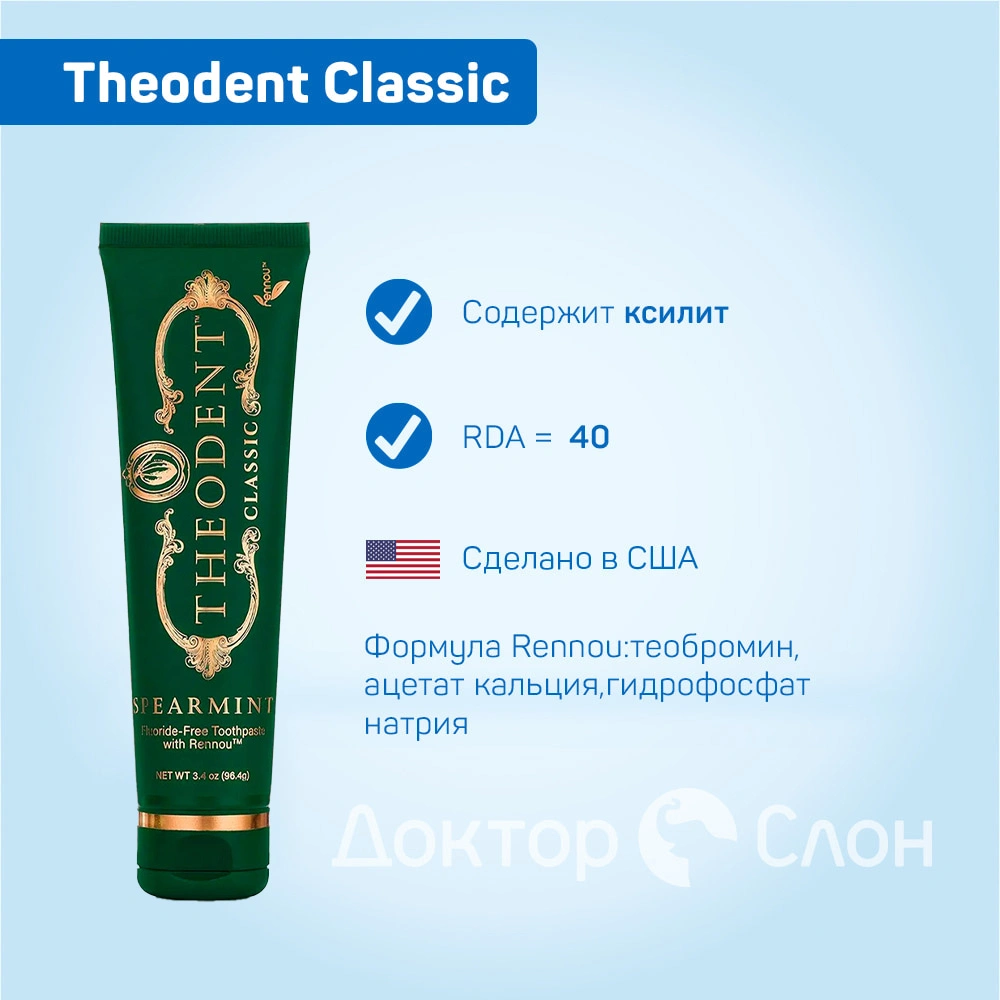 Зубная паста Theodent Classic на основе теобромина - эффективное средство не только профилактики кариеса, но и его лечения на раннем этапе. Ее большое преимущество в том, что она останавливает и обращает процесс развития заболевания в стадии белого пятна: всего через 7 дней применения Theodent Classic кариозные пятна начинают исчезать. Более 30 лет ведущий исследователь компании Theodent Тетсуо Накамото вел непрерывные клинические исследования, чтобы создать революционную формулу Rennou. На сегодняшний день она не имеет аналогов в мире.