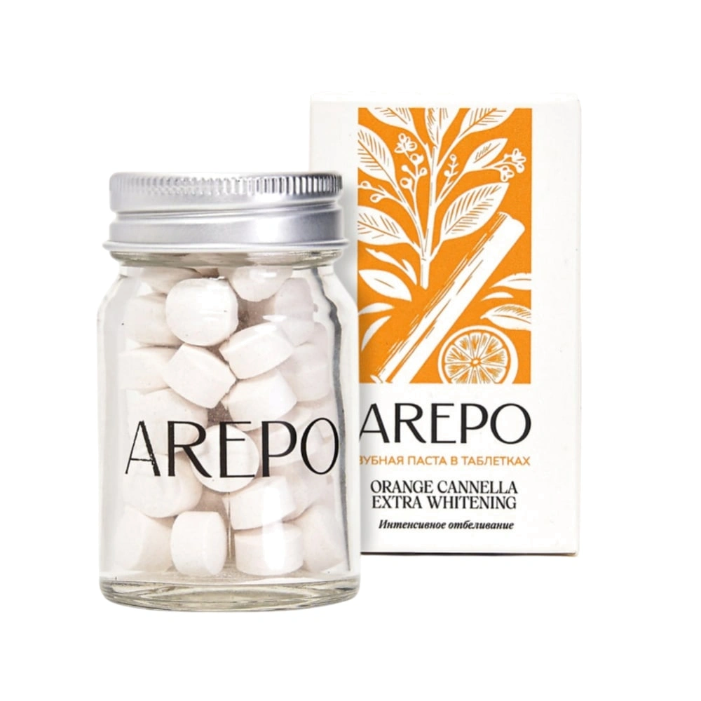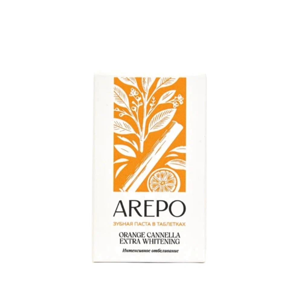 AREPO Orange Cannella Extra Whitening — инновационная зубная паста в таблетках с ярким сочетанием ароматов апельсина и корицы, разработанная для эффективного отбеливания зубов. В упаковке 55 таблеток, которые благодаря комплексу натуральных компонентов (экстракты папайи, бромелайн, эфирные масла) обеспечивают бережное очищение от налета, осветление эмали и длительную свежесть дыхания. Удобная форма выпуска делает пасту идеальной для ежедневного использования, а натуральные компоненты гарантируют безопасность и эффективность ухода за полостью рта.