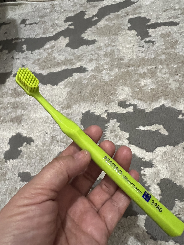 PESITRO UltraClean Super Soft 3980 Имеет увеличенное количество щетинок из ультратонкого полиэстерового волокна Ultra-X обеспечивает эффективное удаление зубного налёта без травматизации мягких тканей. Ручка с гранями позволяет без труда удерживать щетку под правильным углом в процессе чистки, а компактная форма чистящей головки делает возможным уход даже за такими труднодоступными местами, как задние стенки дальних зубов. Усиленное крепление щетины в головке зубной щетки предотвращает преждевременное выпадение щетины.