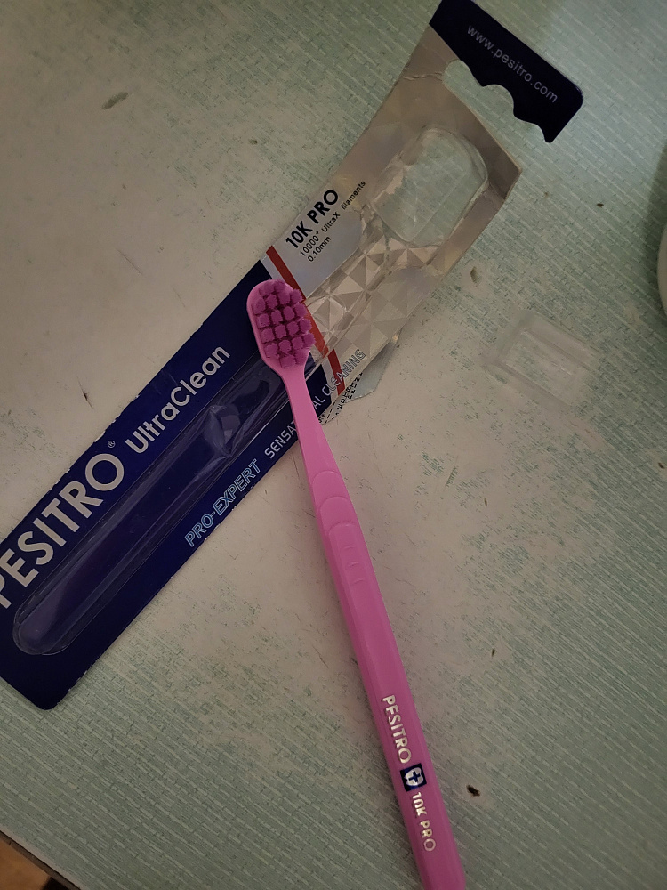 Зубная щетка PESITRO 10К Pro Ultra soft Эта мягкая зубная щетка также идеально подходит людям с некариозными поражениями - эрозией и клиновидным дефектом. Гингивит, пародонтит, пародонтоз, гиперестезия - все это так же является показаниями к применению мягкой зубной щетки Pesitro 10K Pro. Щетка мягко и бережно очищает поверхность эмали, не повреждая её, а увеличенное количество ультратонких щетинок диаметром 0.10мм деликатно полируют зубы. Компактная форма головки исключает травмирование мягких тканей. Закругленные ультратонкие щетинки обеспечивают профессиональное естественное отбеливание.