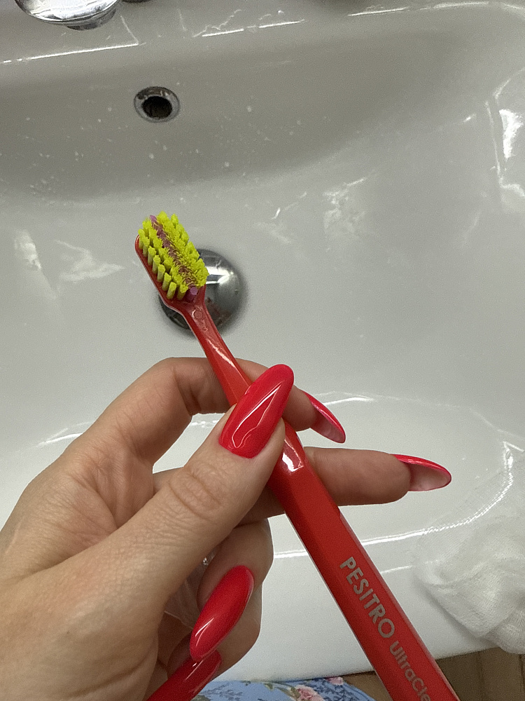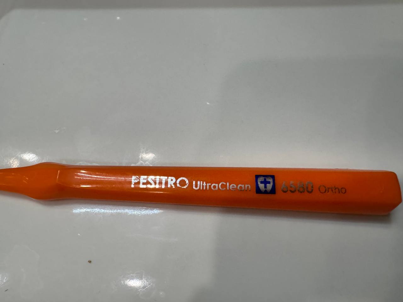Зубная щетка PESITRO Ortho Имеет увеличенное количество щетинок из ультратонкого полиэстерового волокна Ultra-X что обеспечивает эффективное удаление зубного налёта с эмали и элементов ортодонтических конструкций. При этом щетка не травмирует мягкие ткани и не нарушает конструкцию брекет-системы.
