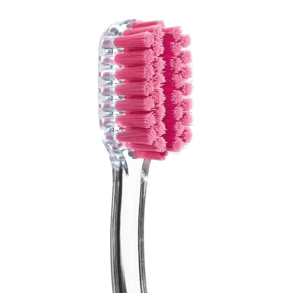 Зубная щётка Revyline S6500 Crystal Ortho оснащена 6500 мягкими щетинками из полиэстера Pedex немецкого качества. U-образная форма щеточного поля позволяет одновременно очищать поверхность зуба и элементы ортодонтической системы, эффективно удаляя микрочастицы пищи и бактериальный налёт в труднодоступных зонах. Заполированные кончики щетины обеспечивают деликатный контакт с эмалью и десной, а улучшенная фиксация волокон повышает долговечность щётки. Компактная головка размером 23×10×9 мм облегчает доступ к задним зубам, длина щетины 7–9 мм и диаметр 0,102 мм оптимальны для аккуратной очистки вокруг брекетов. Эргономичная ручка из медицинского пластика ПЭТГ удобно лежит в руке и устойчива к влаге.