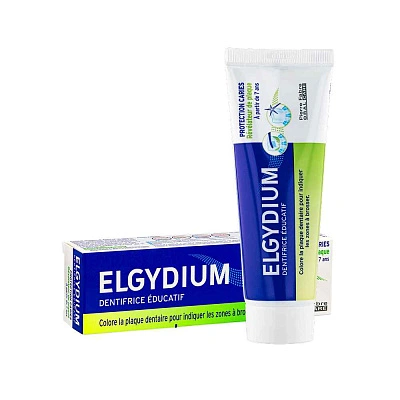 2. Зубная паста Эльгидиум Plaque-disclosing. Средство гелеобразной текстуры для взрослых и детей старше 7 лет. Пищевые красители окрашивают остатки налёта зелёным цветом, помогая отрабатывать навык правильного очищения при каждом использовании. Содержащийся в составе фтор защищает от образования кариеса и способствует укреплению эмали.